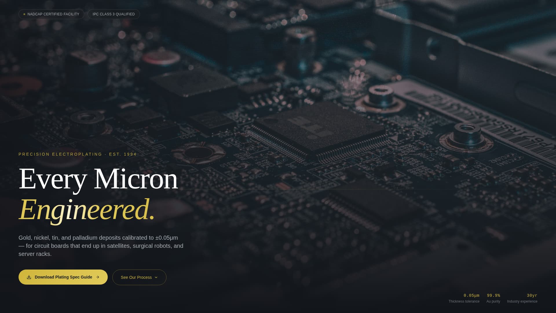 The header plays slow-motion footage of a printed circuit board rack descending into an electrolyte bath. The camera pulls back from a tight surface shot to reveal the full immersion tank, robotic arms, and digital thickness monitors. A single headline, "Every Micron Engineered," fades in over the footage. Navigation stays hidden until the visitor begins scrolling.