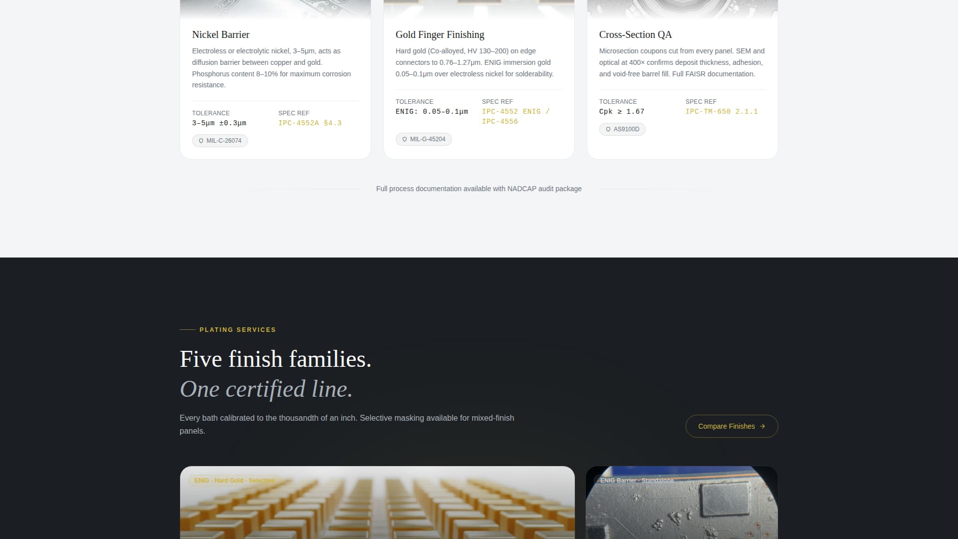 This template is built for electroplating facilities and contract manufacturers serving high-reliability electronics markets. It speaks directly to technically informed buyers who evaluate suppliers on process transparency and certification depth.