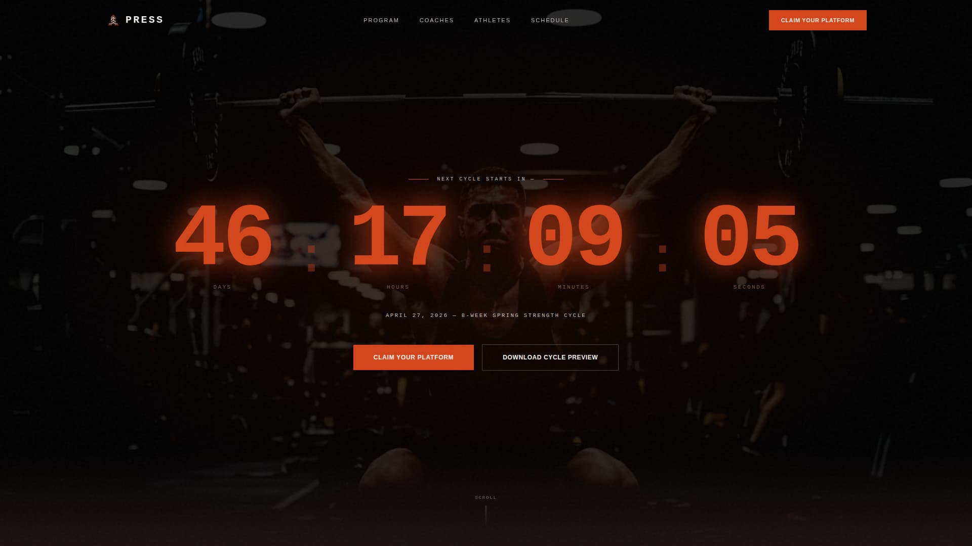 Press is a single-page booking template designed for a weightlifting academy. It opens with a full-viewport countdown timer ticking toward the next training cycle, then scrolls through four seasonal program phases. Two conversion paths, direct booking and a downloadable cycle preview, work together to move every visitor type toward action.