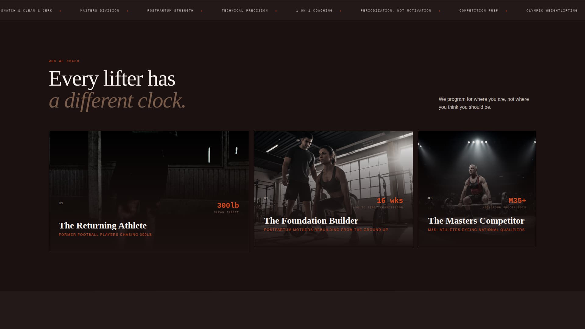 This template fits strength coaches and weightlifting academies that run structured, cycle-based programming. It works best when the business has a defined intake process and wants visitors to book an assessment rather than browse passively.