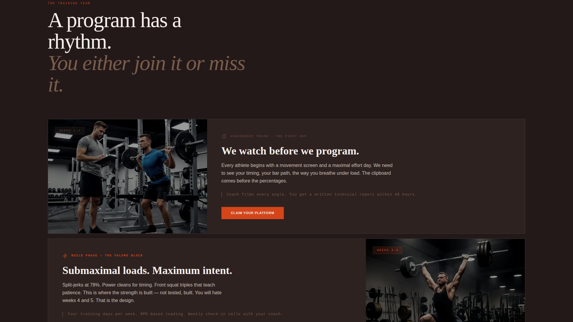 The page scrolls through four distinct training phases: assessment, build phase, competition peak, and deload. Each phase is timestamped with a cycle month, making the program feel like a living calendar the visitor can either join or miss.