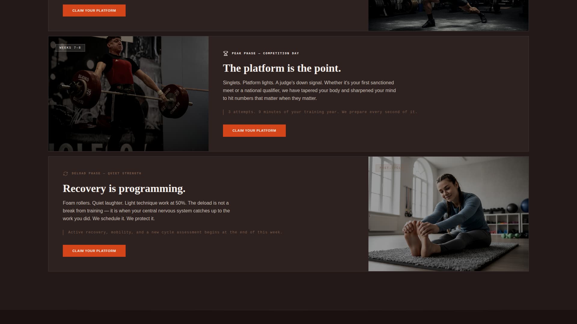 | Deload and Recovery | Closes the cycle narrative with recovery imagery and quiet athlete moments |