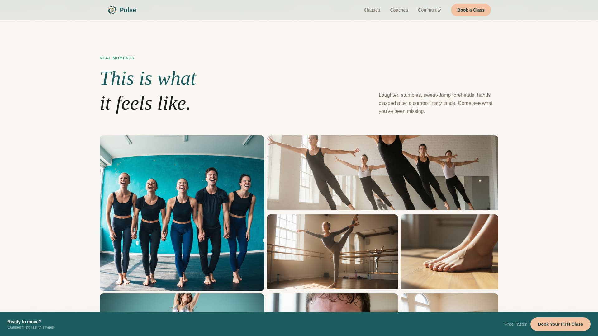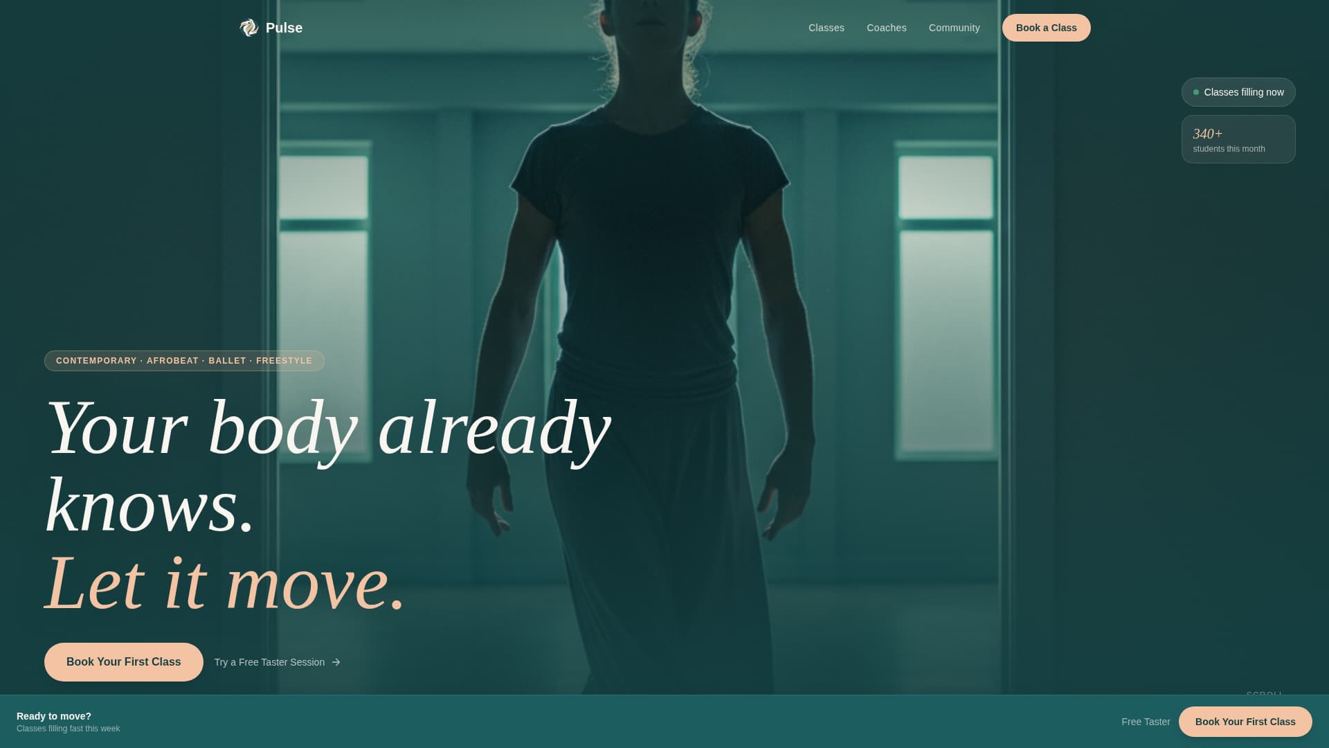 Many dance studios lose potential students at the first digital touchpoint. A generic fitness page cannot convey the texture of a real rehearsal room. Pulse solves this by putting atmosphere, community, and trust signals front and center before the booking form ever appears.