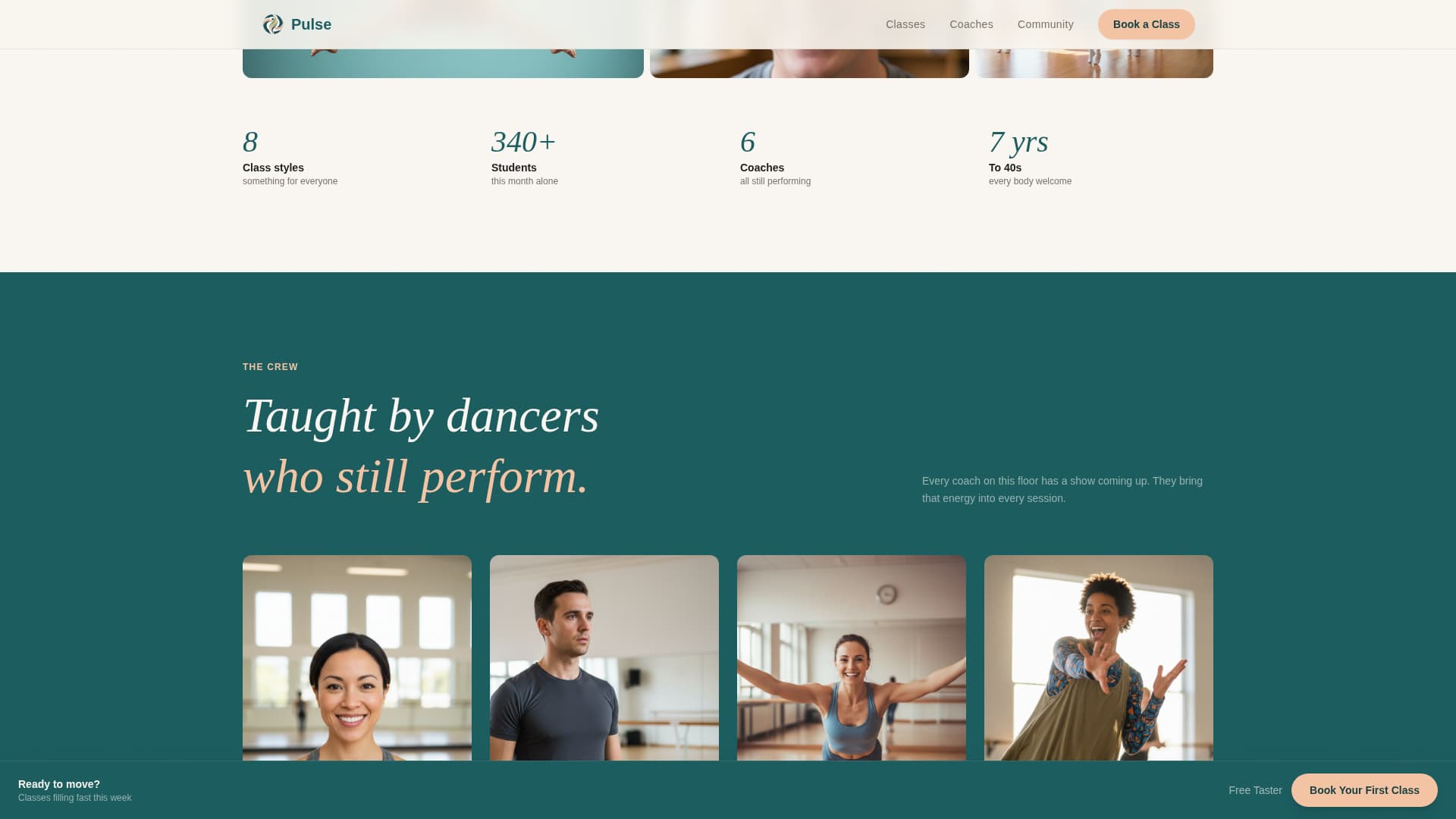 Pulse is a scroll-reveal landing page template built for dance coaching services. It combines a cinematic full-viewport hero, a community photo mosaic, coach portrait cards, a living class schedule, and an inline booking flow. The Organic Flow design with the Teal Catalyst color system creates a warm, immersive feel that turns curious visitors into booked students.
