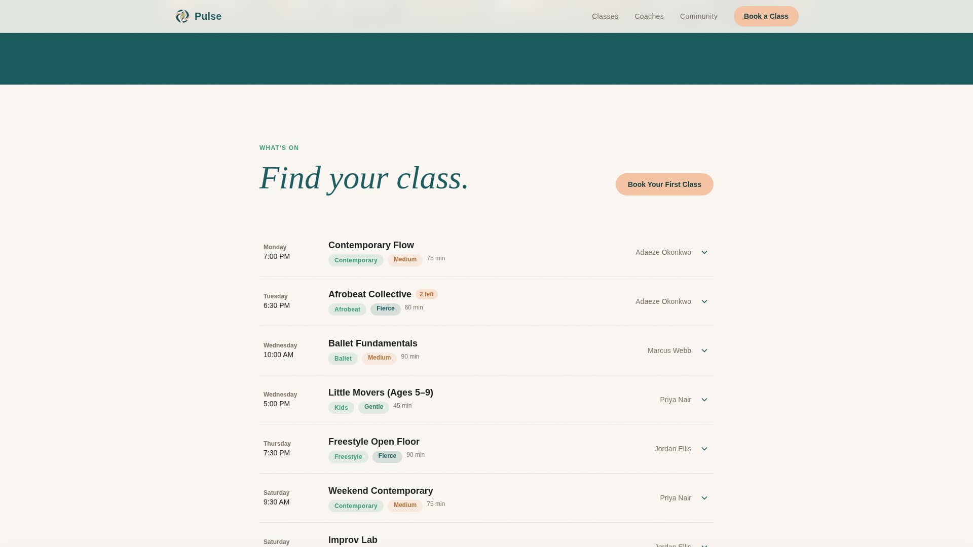 The class schedule breathes open on scroll. Each session is tagged by style, intensity, and instructor. Visitors can expand individual sessions for more detail using a FAQ-style accordion interaction without leaving the page.
