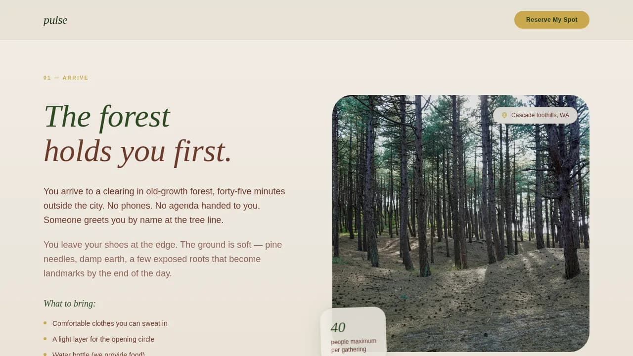 Pulse is a full-width immersive landing page template crafted for ecstatic dance retreat organizers. It guides visitors through a sensory-led, step-by-step journey from arrival to shared meal, using warm Forest Trust colors, floating testimonial cards, and a visual spot calendar that makes event registration feel like joining a living, breathing community.