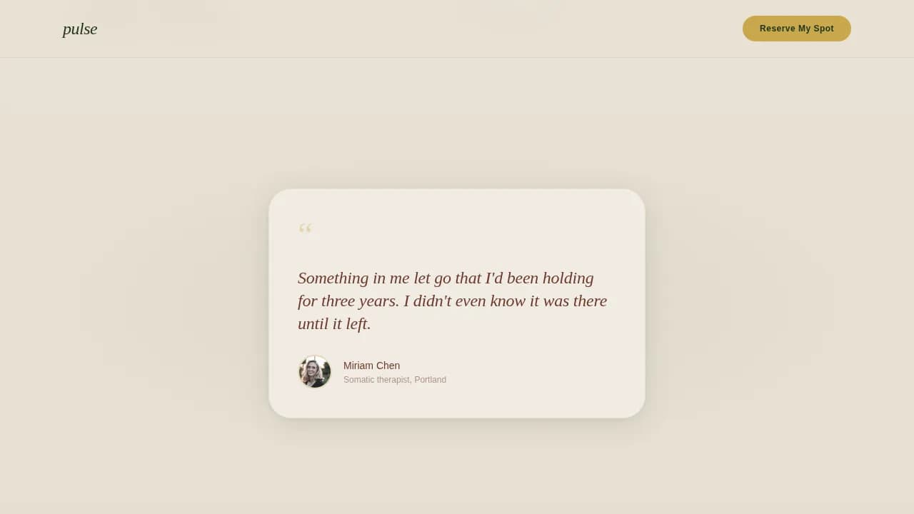 | Hero Testimonial Card | Opens with emotional social proof and primary "Reserve My Spot" call to action |