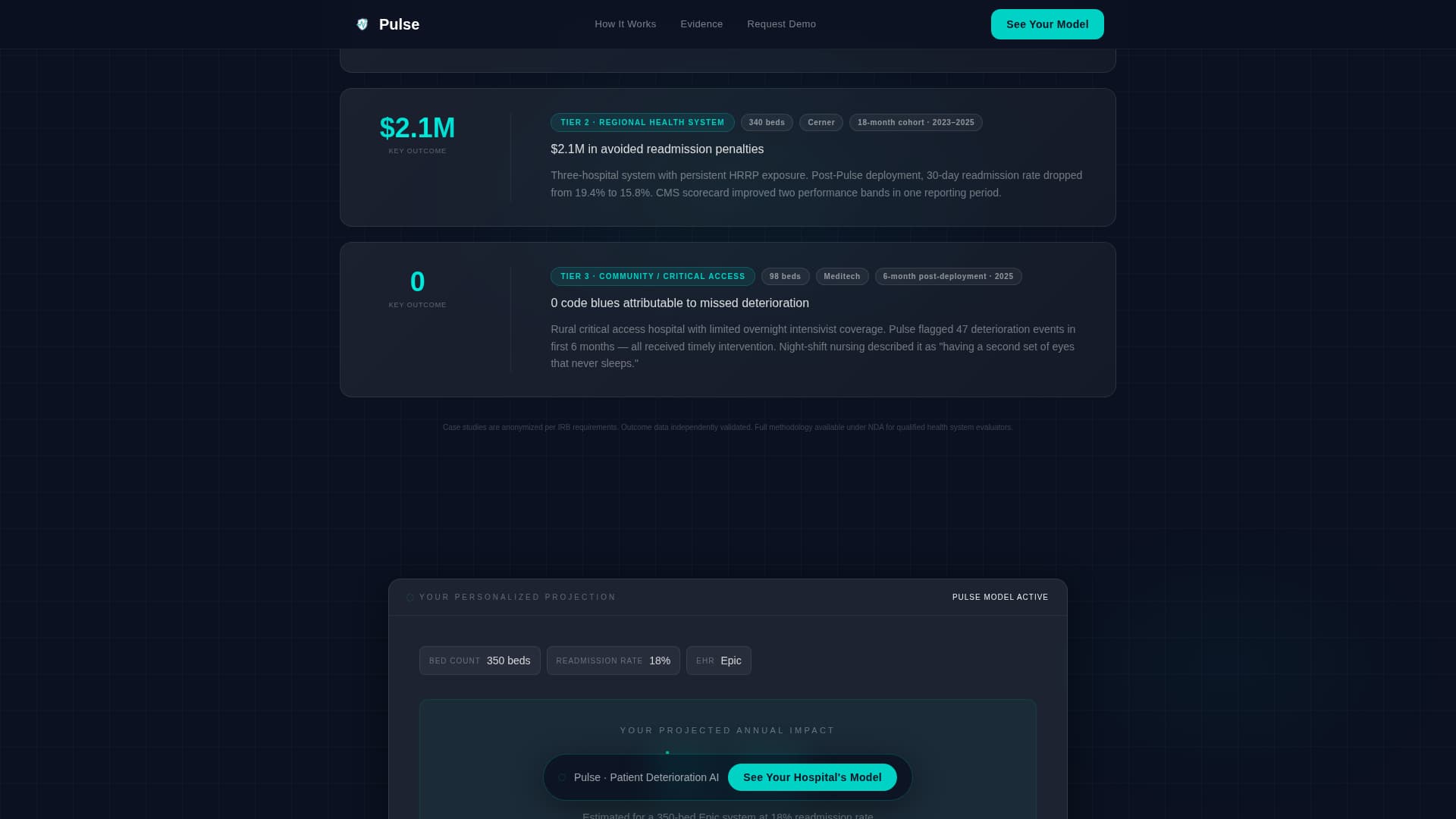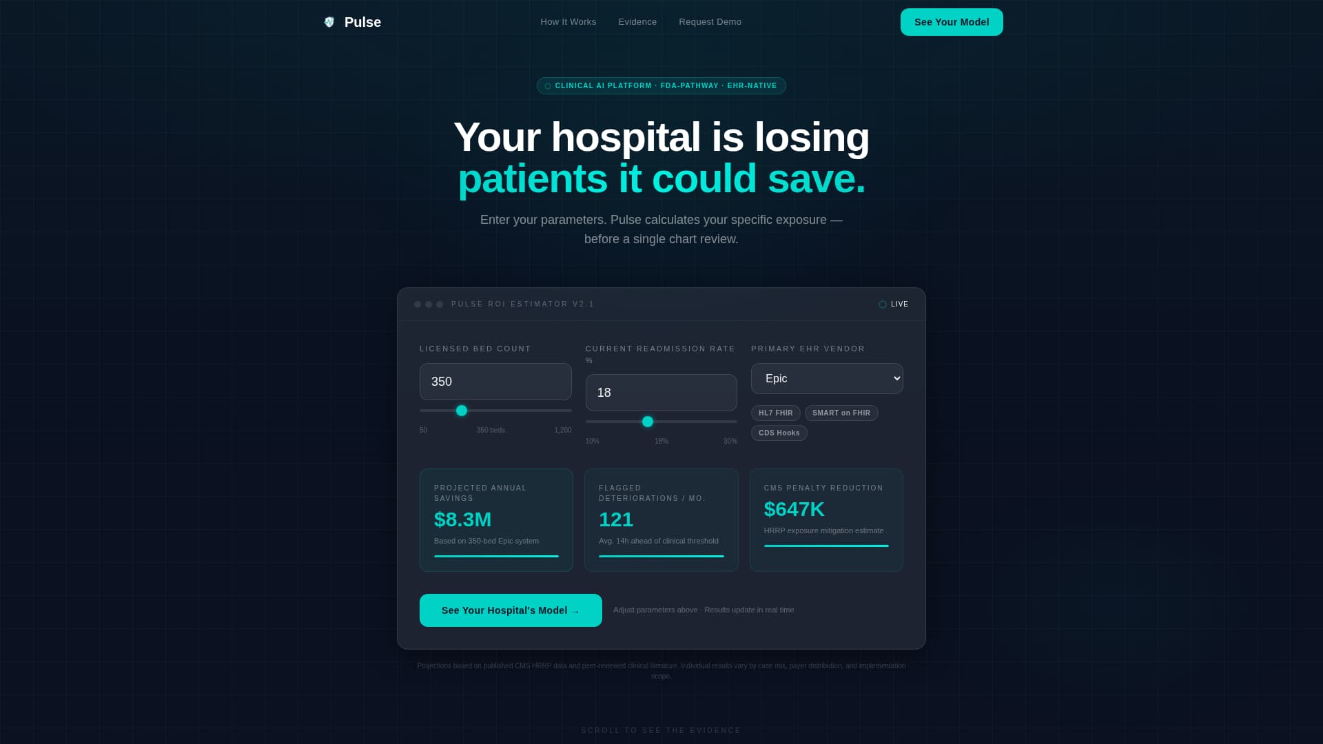 The hero section is an interactive estimator, not a static headline. Visitors input their hospital's bed count, readmission rate, and EHR vendor from a dropdown. As they type, number ticker animations display projected annual savings, monthly flagged deteriorations, and CMS penalty reduction in real time. The tool itself is the hook.
