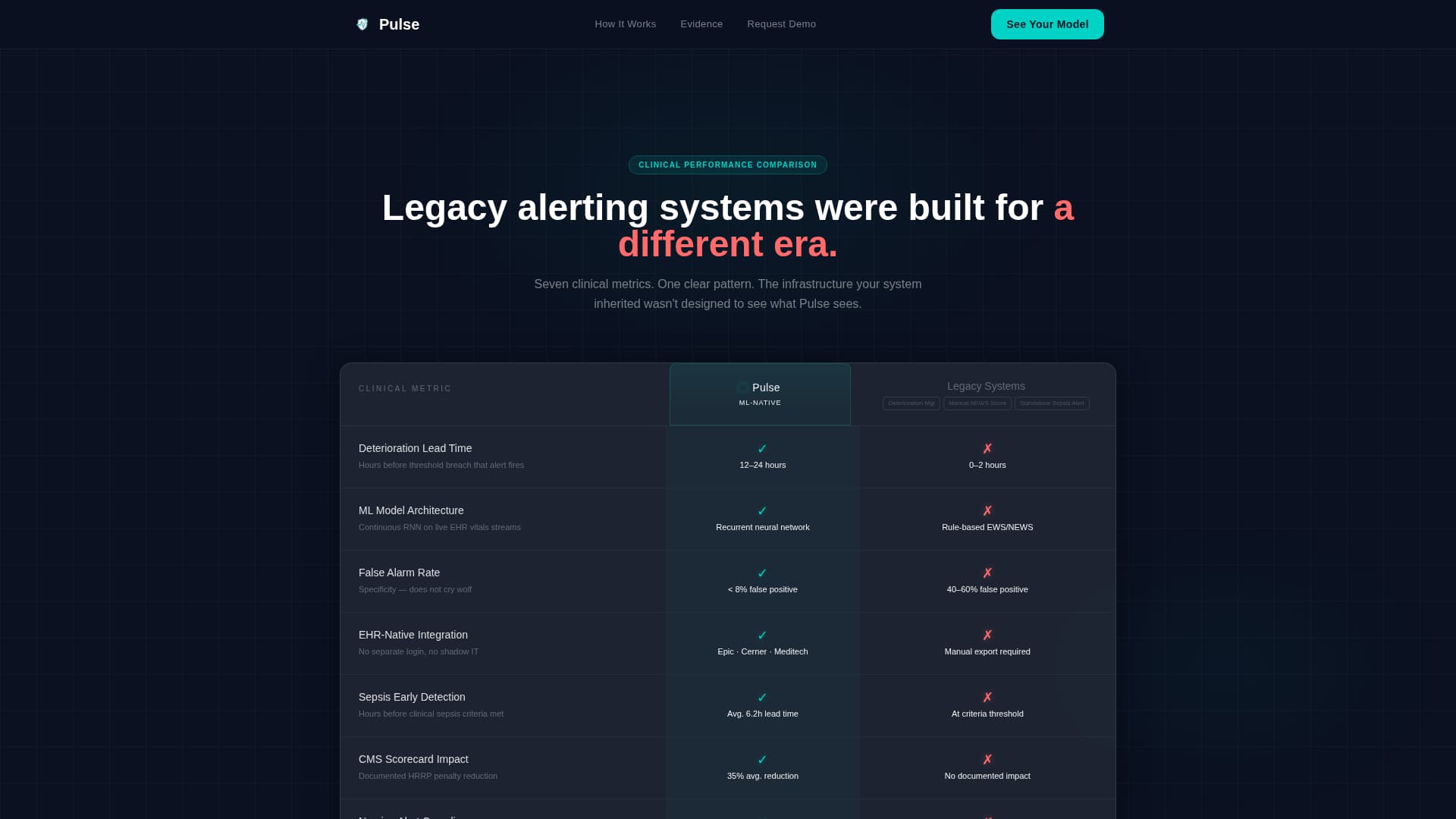A seven-metric comparison table renders Pulse against legacy alerting systems in a frosted glass card layout. Clinical teal checkmarks float on glass rows for your platform. Warning coral indicators mark competitor deficits. Hover states animate on each row, keeping the data feel interactive rather than static.
