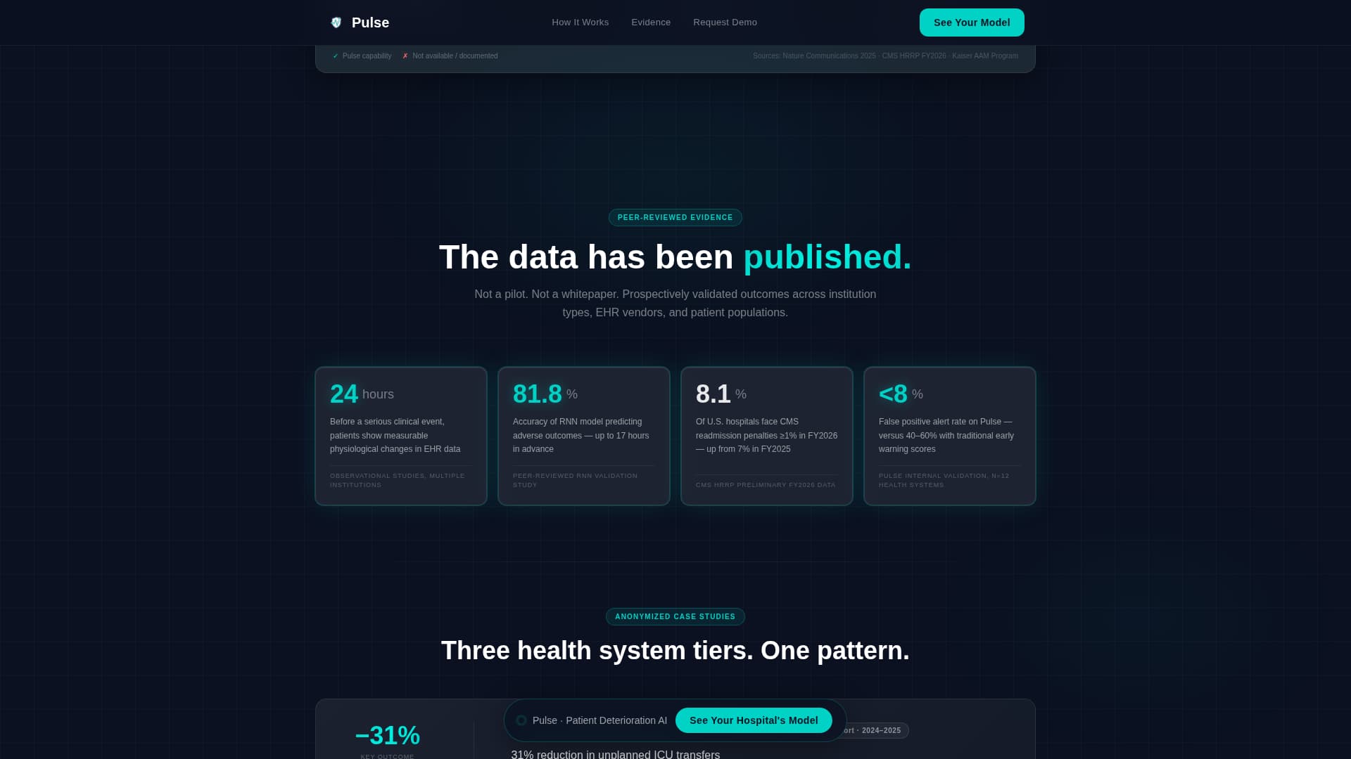 The evidence layer presents outcome data and anonymized case studies as glowing data cards. Each card sharpens into focus as it enters the viewport using intersection observer reveals. Three health system tiers are represented, giving buyers at different organization sizes a relevant data point.