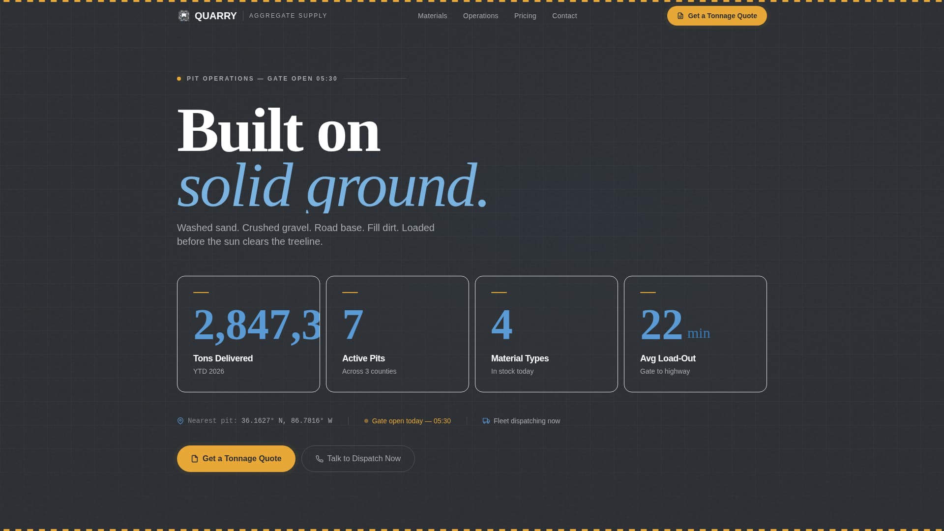 Quarry is a modular card grid landing page built for sand and gravel mining operations. It leads with an oversized stats wall, walks contractors through a clear problem-to-solution arc, and closes with a lead capture form built around tonnage quotes. The design uses a weathered job-site palette that signals operational credibility from the first scroll.