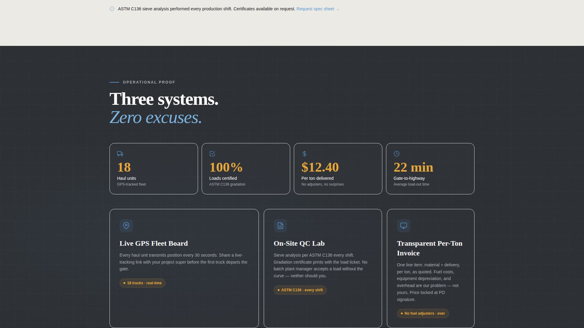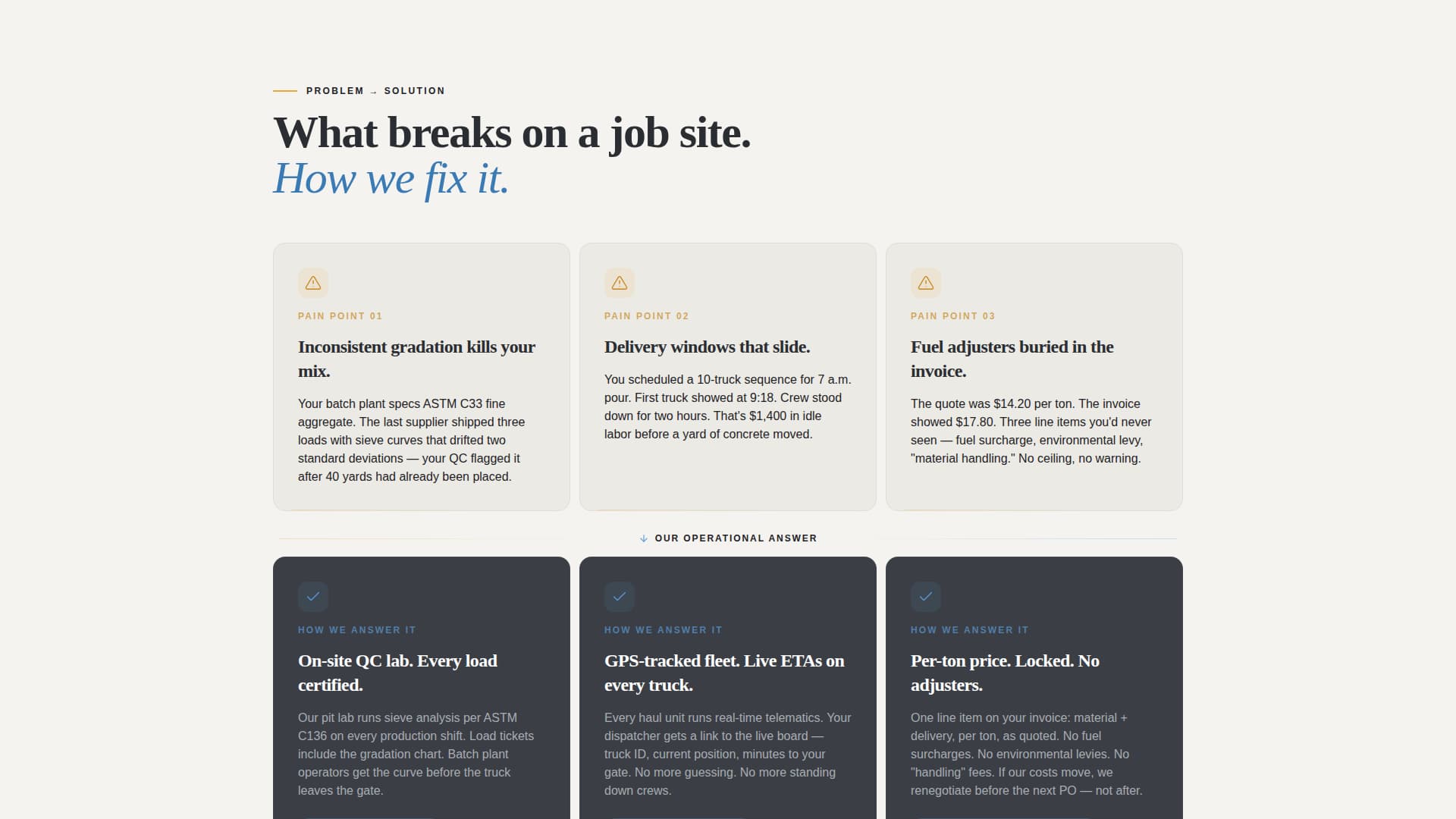 The scroll structure is organized into three deliberate card rows. The first row surfaces the three most common contractor frustrations: inconsistent gradation, unreliable delivery windows, and surprise surcharges. The second row mirrors each problem with a direct operational answer. This layout builds trust progressively rather than asking visitors to take your word for it.