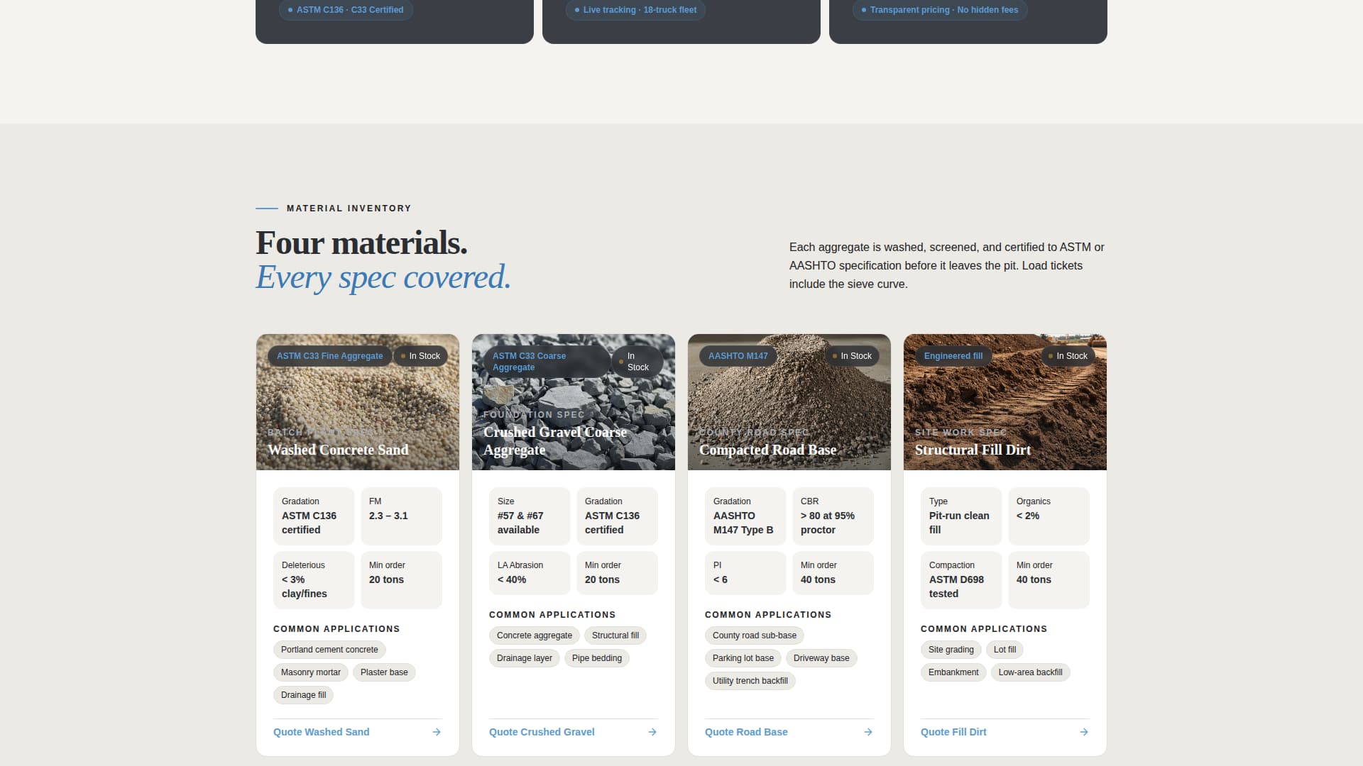 Each aggregate product gets its own tile in the third card row. Tiles include a close-up texture swatch, American Society for Testing and Materials (ASTM) spec compliance notation, and a list of common applications. This gives procurement buyers the technical detail they need without requiring a separate document download.