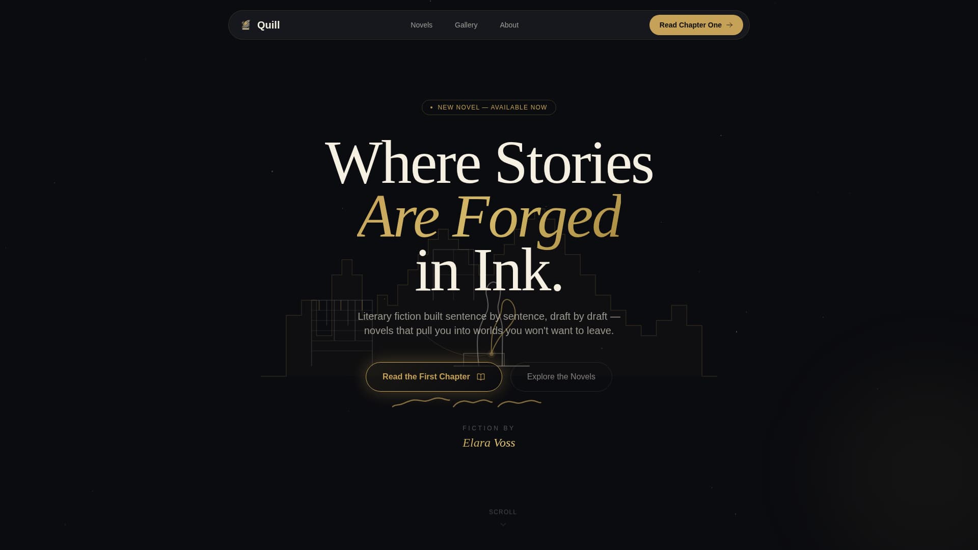 Quill is a masonry-style landing page template built for fiction authors who want their web presence to feel as compelling as their prose. With an animated ink-drawing header, a gallery-style scroll of literary artifacts, and a gold-accented Obsidian and Gold color system, Quill turns a single page into an immersive author experience that moves visitors toward reading the first chapter.