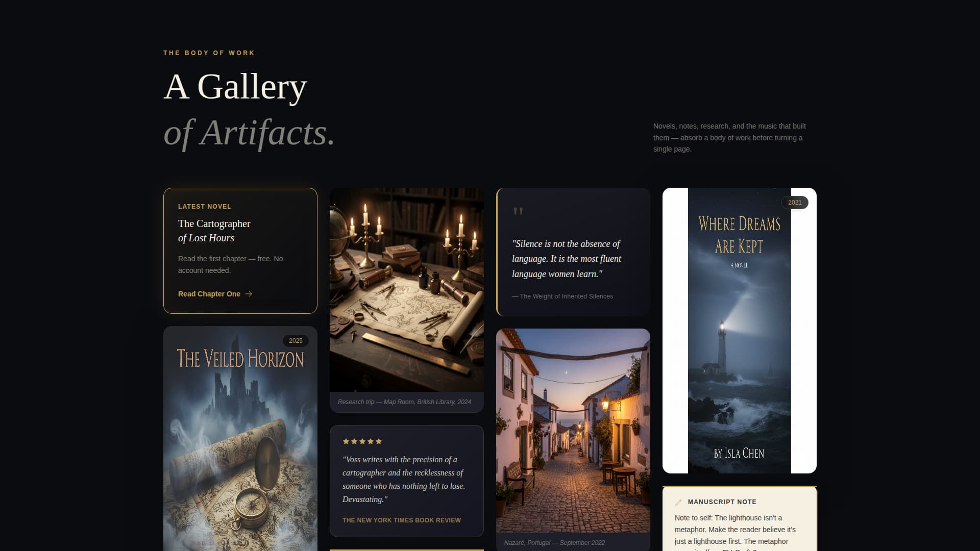 The scroll is structured as a literary exhibition. Cards load in staggered clusters, each cluster anchored to one novel. Each card type represents a different artifact: a tilting book cover that reveals its synopsis on hover, a broadside-style pull quote, a research trip photograph, a handwritten revision note, a starred review fragment, or a listening playlist.