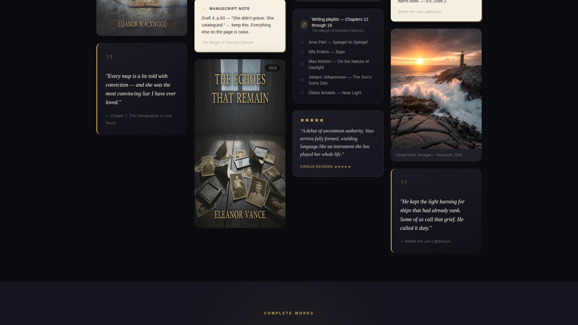 Quill delivers a fully designed, single-page layout that functions as a literary exhibition space. Every visual element is intentional and connected to a specific moment in the author's creative world.
