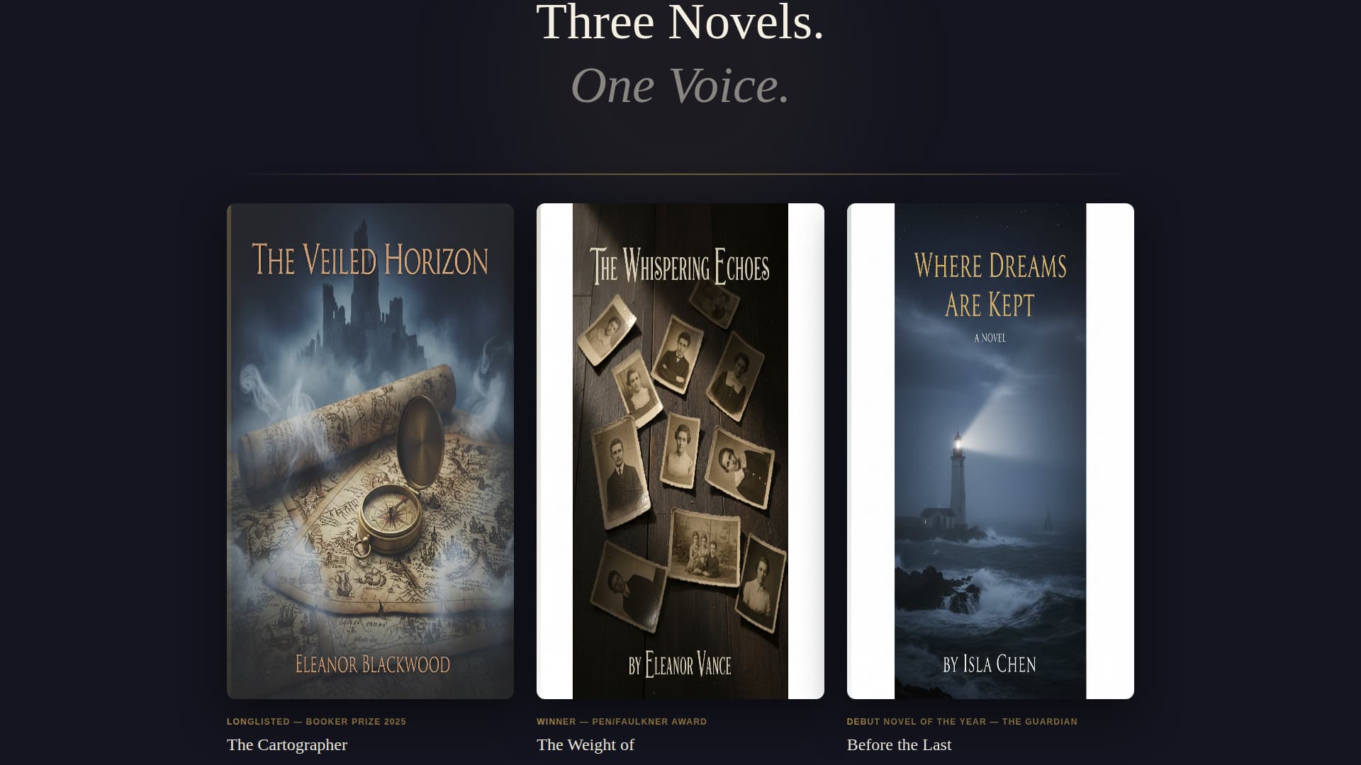 The visual identity follows an Atelier Studio theme. Every design choice reinforces the feeling of a leather-bound first edition with gilded page edges. The overall impression is a private study at golden hour: warmly lit, deliberately arranged, and unmistakably literary.