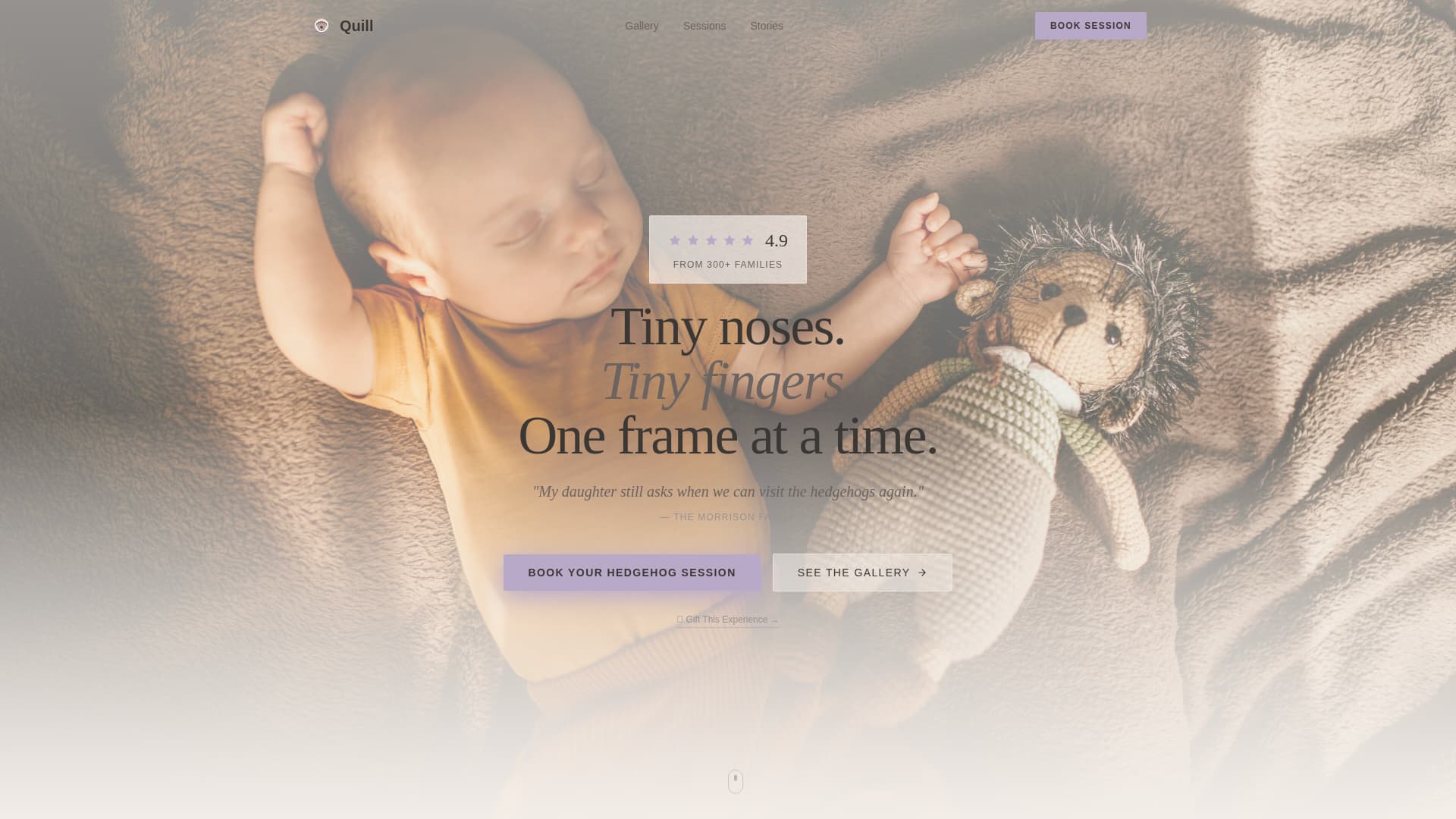 Quill is a masonry-style landing page built for hedgehog photography studios. It opens with a glowing 4.9-star review header, flows through a community-scrapbook photo grid, and closes every scroll with a warm nudge to book. The design feels like a quiet Saturday morning, and every section moves visitors toward booking a session or gifting one.