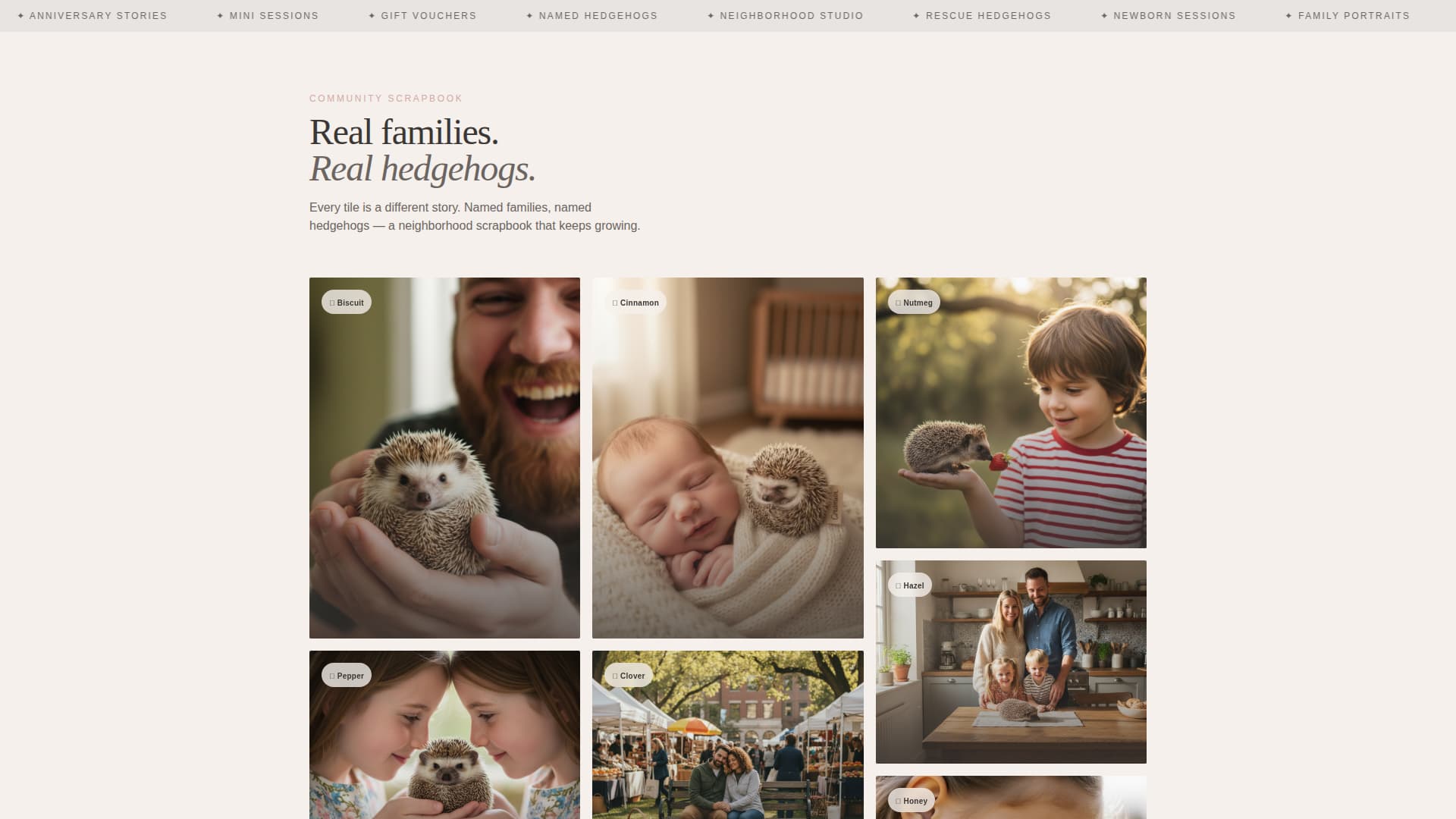 The scrolling gallery uses a masonry layout where each tile is a different family's session. Captions name the family and the hedgehog, turning a photo grid into something that reads like a neighborhood scrapbook. Tiles link to mini-stories rather than standalone galleries.