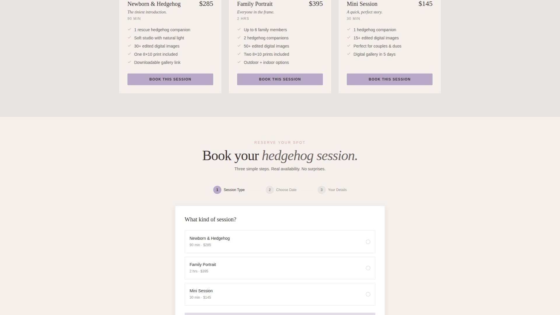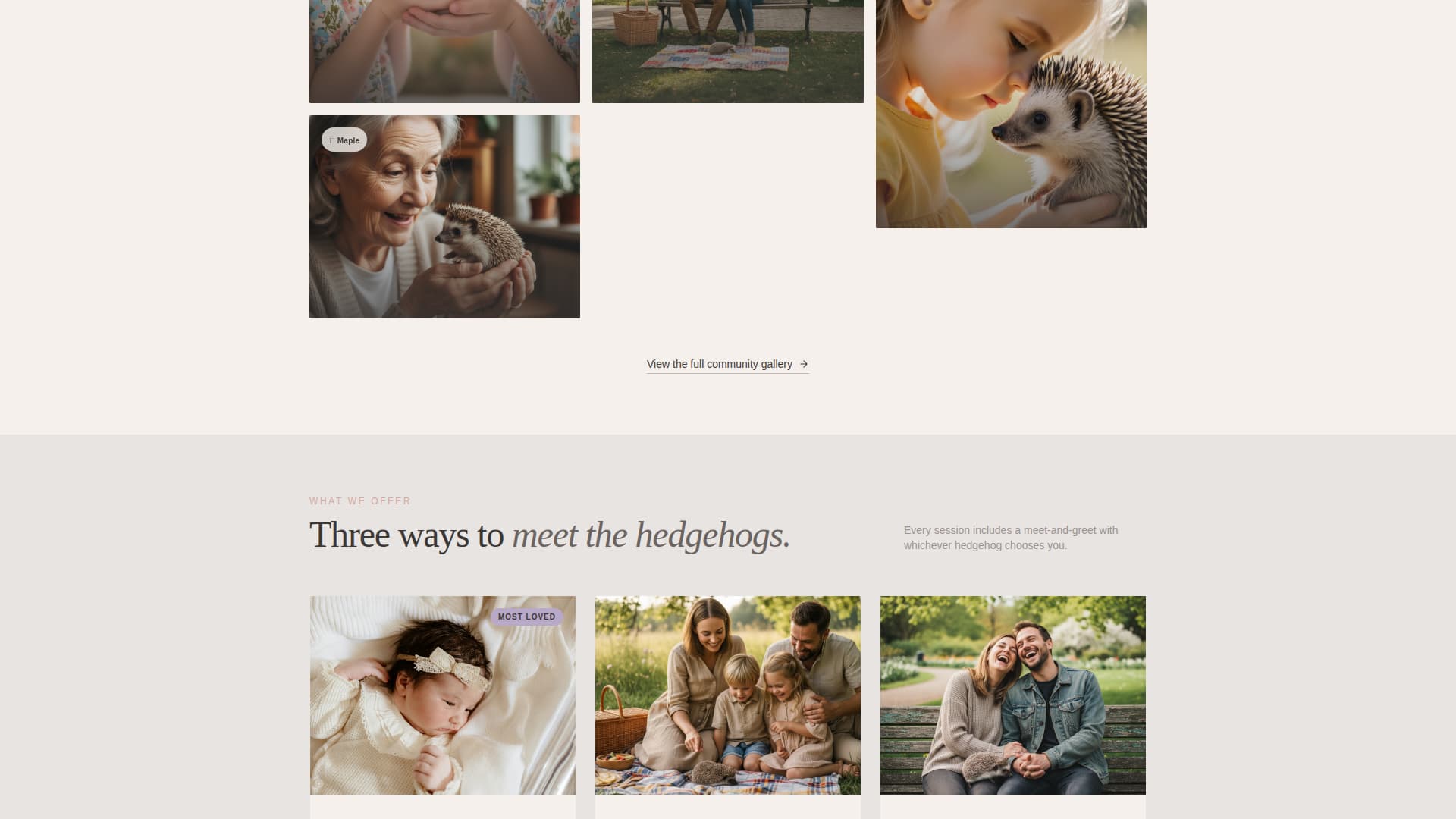 This template is built for independent hedgehog photography studios that want their page to feel as warm and human as their sessions. It suits any small creative studio where the experience itself is the product.