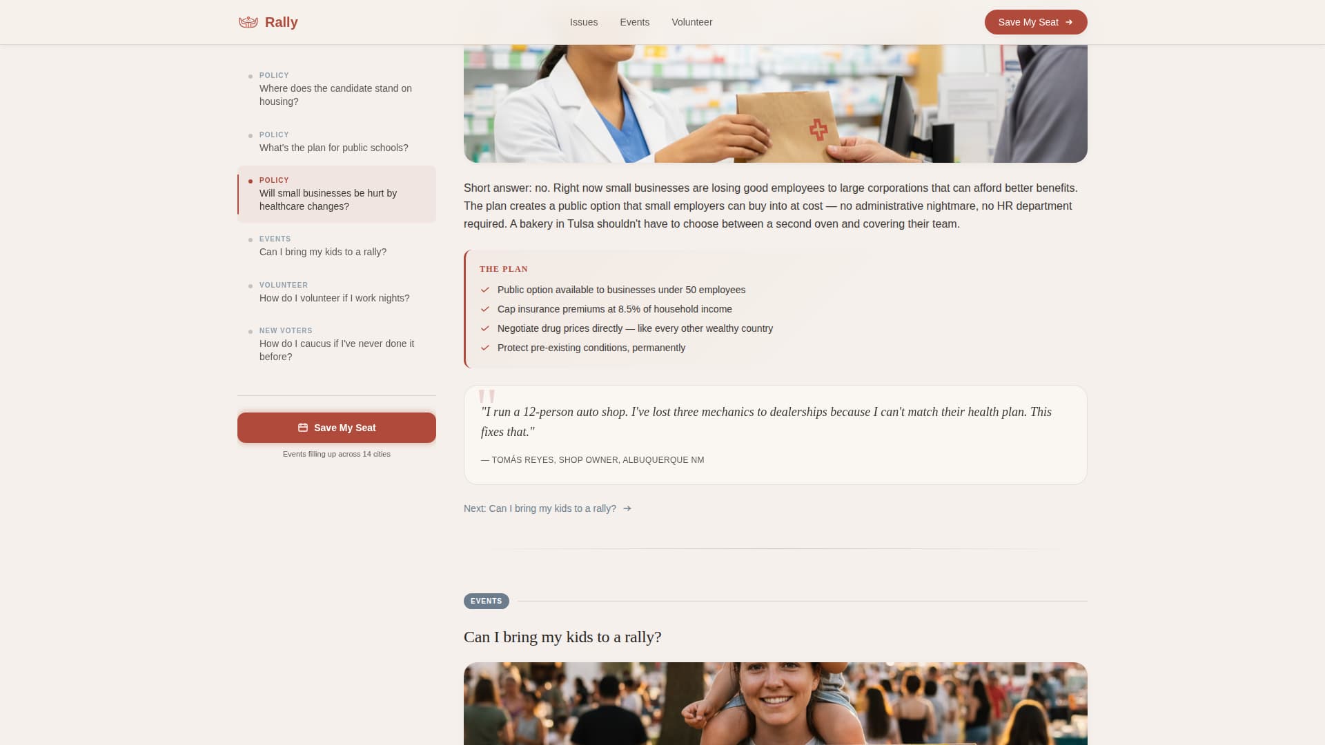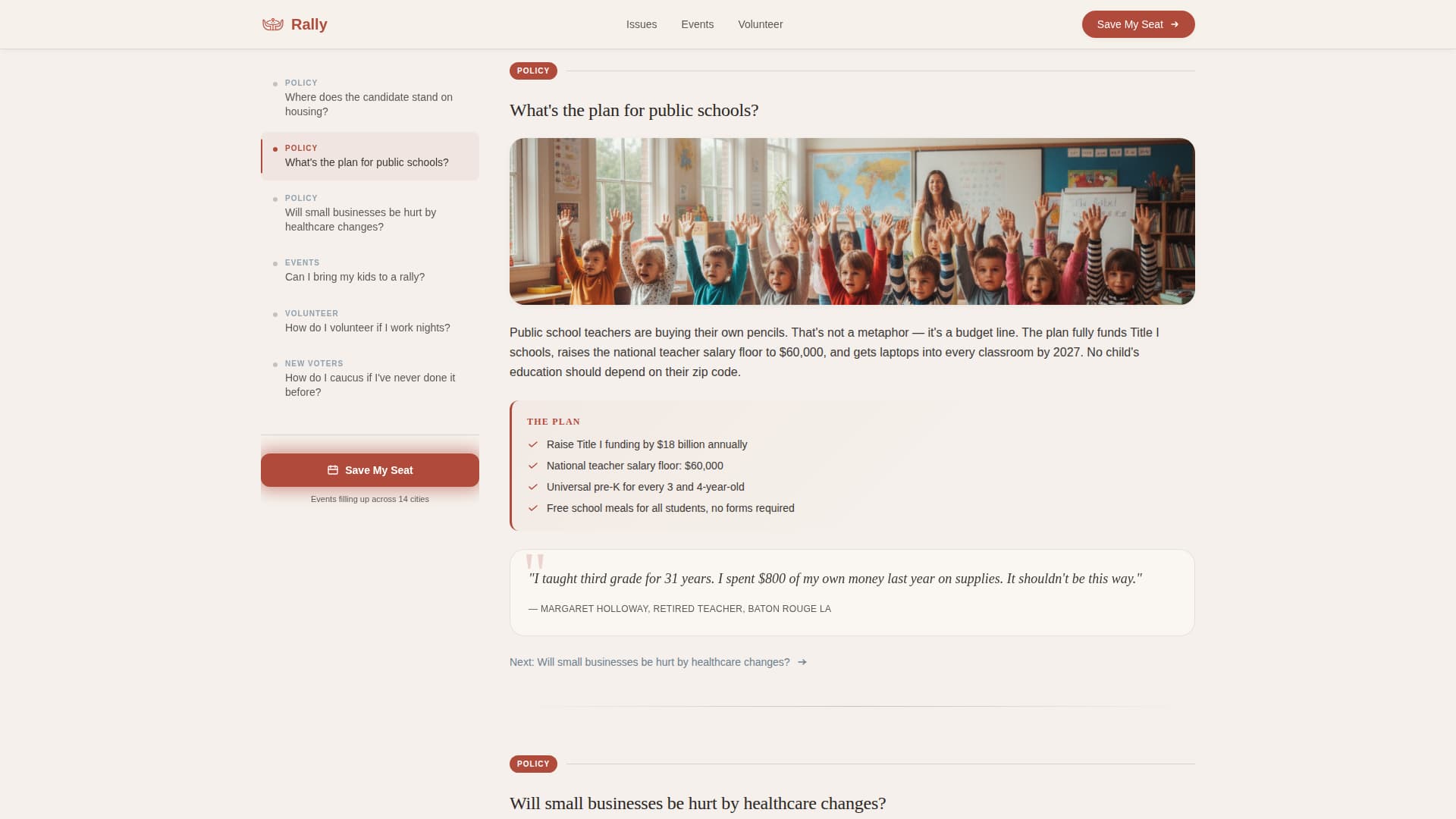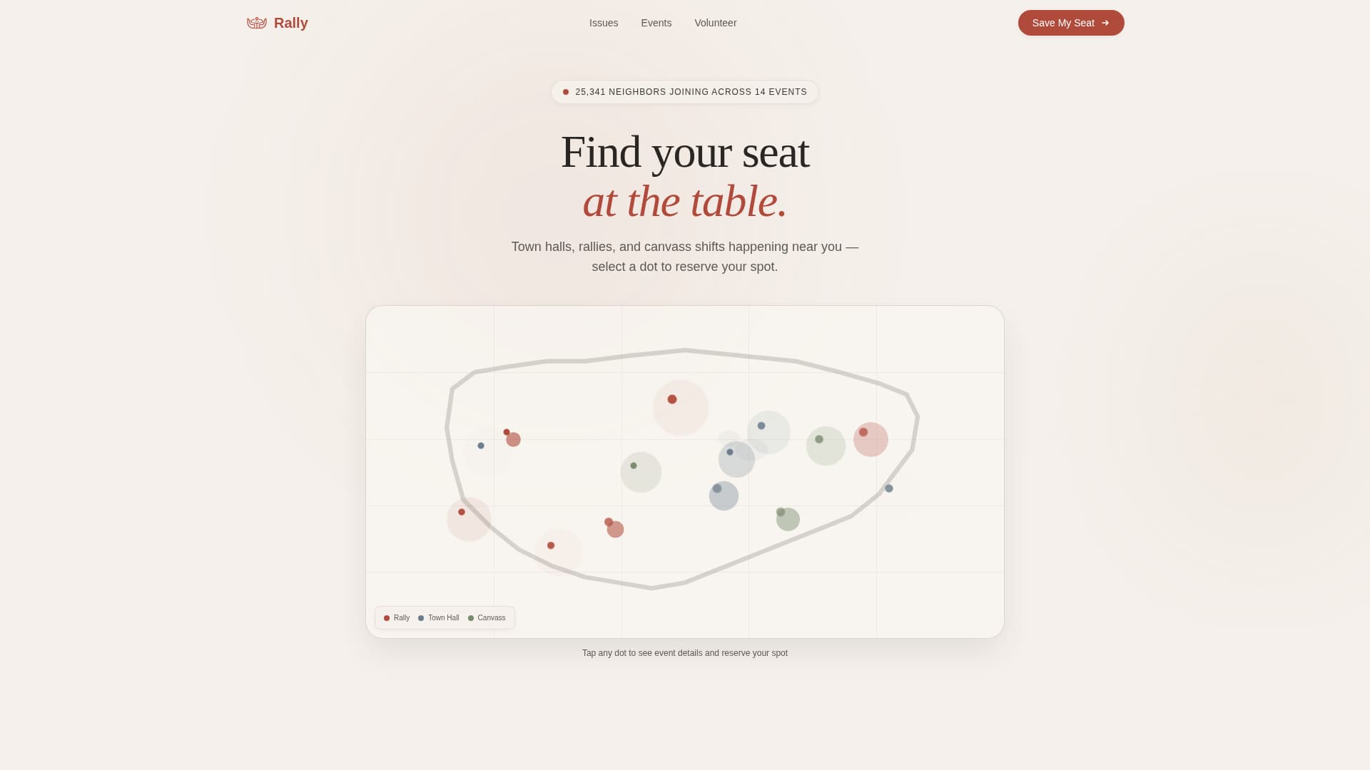 Rally is a single-page campaign headquarters designed for presidential and governor races. An interactive map greets visitors with pulsing event dots, a sticky FAQ sidebar answers real constituent questions, and a focused "Save My Seat" form turns curiosity into committed attendance. The kitchen-table visual tone keeps every section approachable and civic.