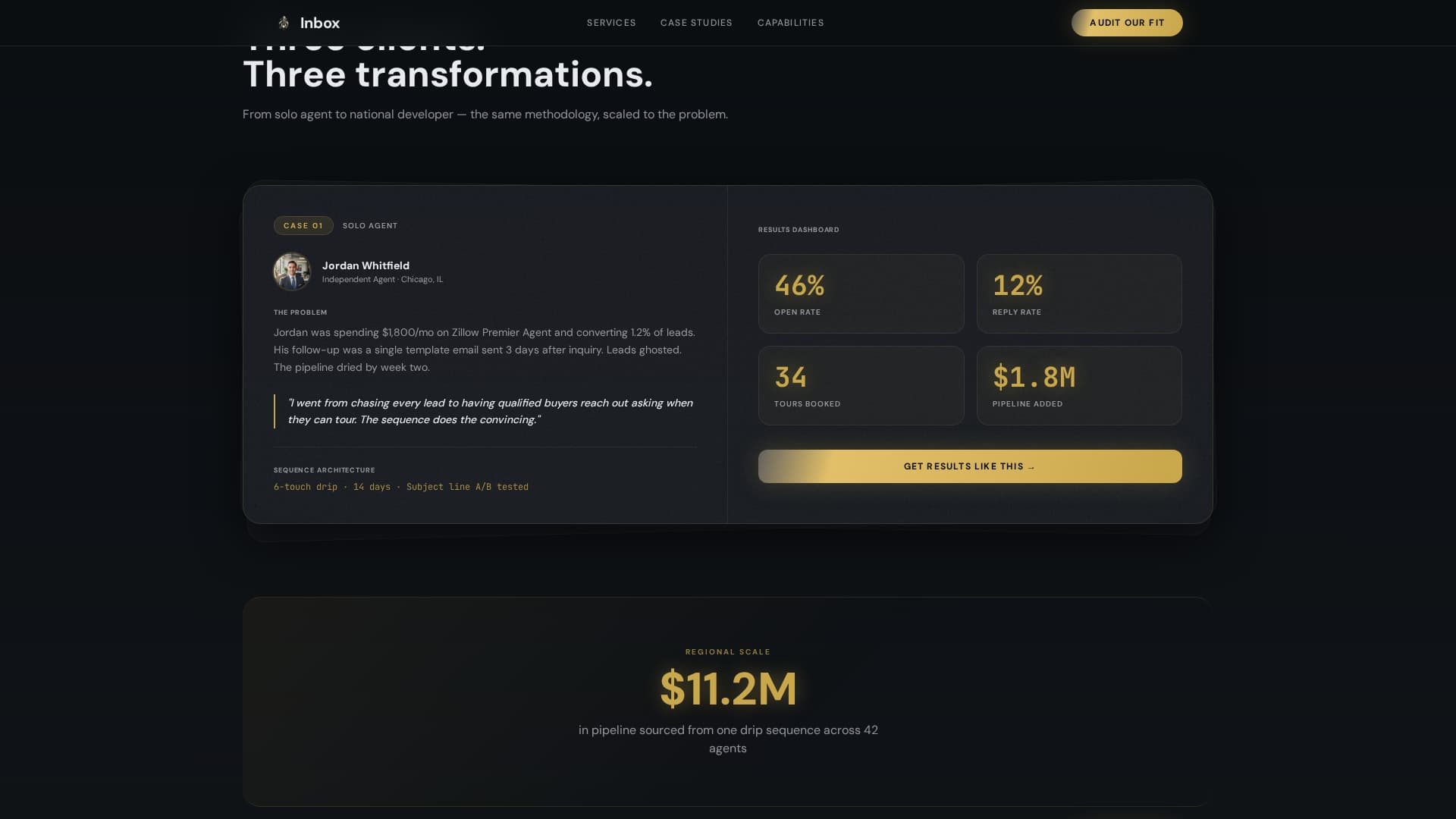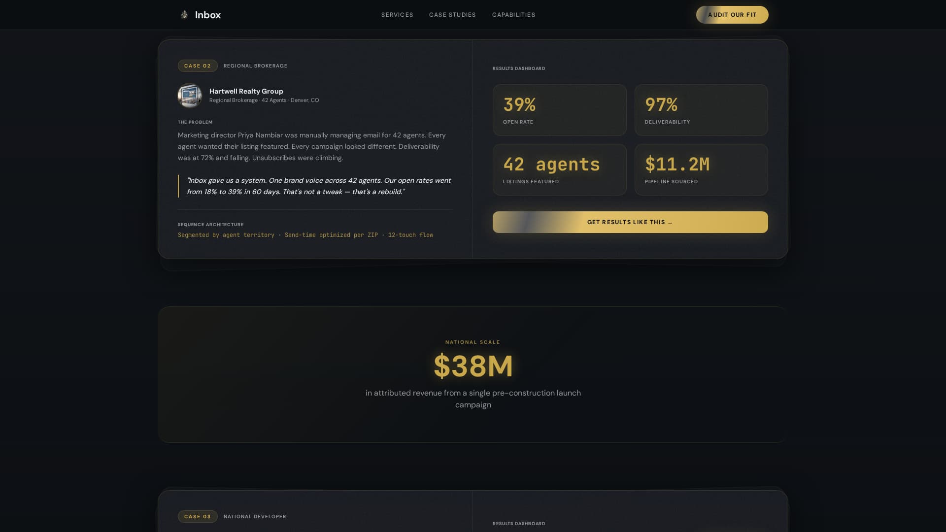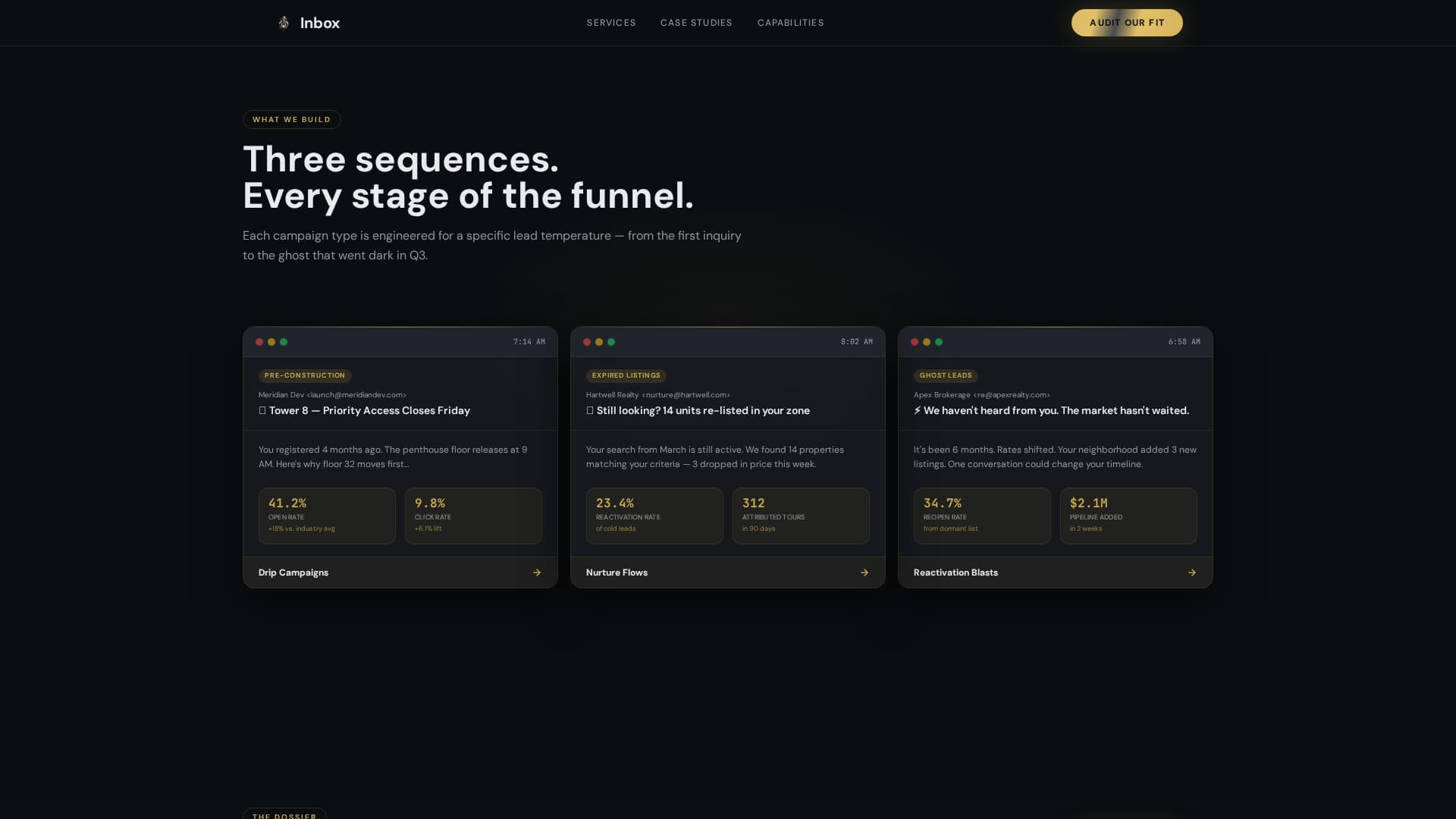 Inbox is a real estate email marketing agency landing page built for high-stakes B2B conversion. It showcases drip campaigns, lead nurture flows, and reactivation sequences through escalating case studies, animated metric counters, and a glassmorphic dark design. The primary call to action, "Audit Our Fit," targets brokerage directors, development firms, and prop-tech platforms ready to buy email at scale.