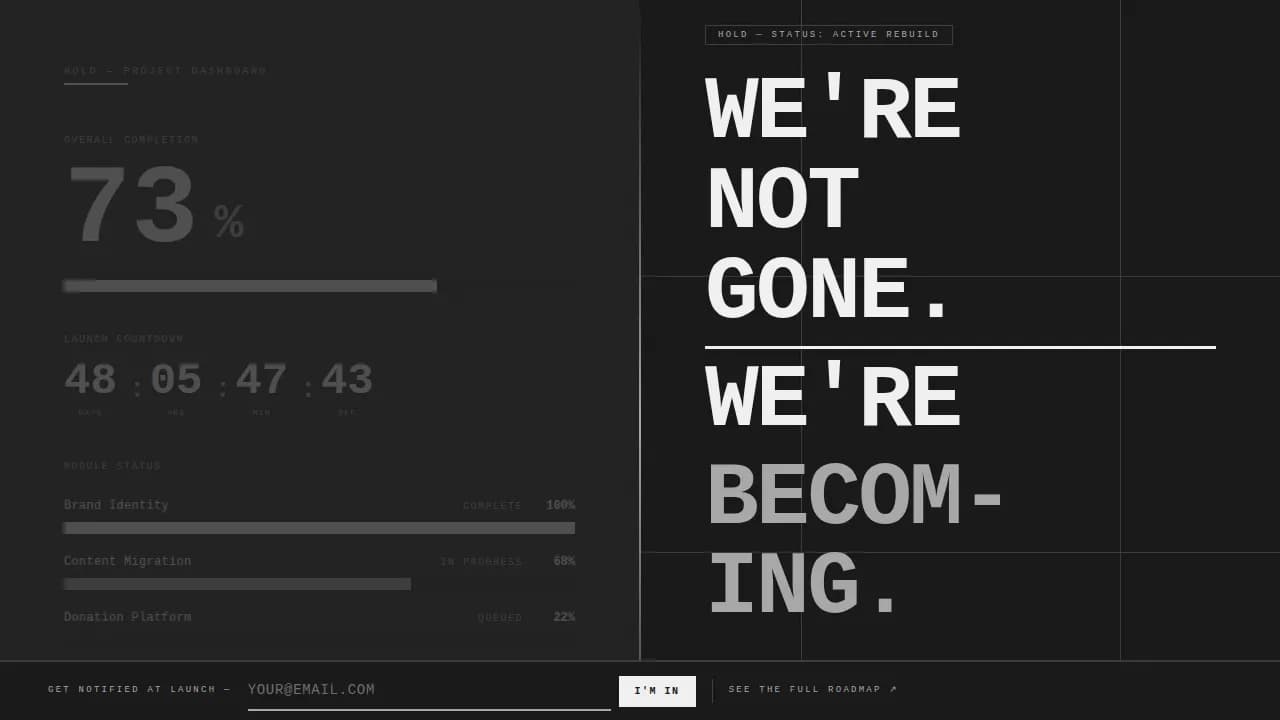 This template is a digital holding room that goes live when a nonprofit's old site comes down and the new one isn't ready. It communicates active transformation through live metrics, a before/after comparison engine, and stark brutalist architecture. Every section is built to prove the organization is alive, building, and worth waiting for.