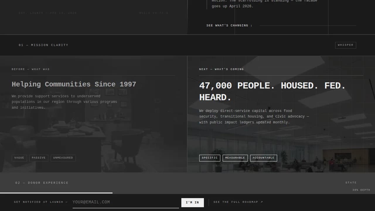 Three stacked sections each pair the old digital presence against the new one. The old side uses a muted, cramped layout behind a translucent gunmetal overlay. The new side breaks free with full-bleed brutalist type and visible gridlines, like architectural drawings pinned to a wall. The contrast between models builds in intensity: first section whispers, second section states, third section shouts. This engine makes the case that this nonprofit is worth waiting for without a single written promise.