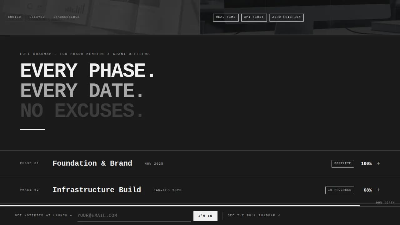 A "See the Full Roadmap" link expands an inline accordion showing all milestones with dates in MM/DD/YYYY format. This is the transparency feature that board members and grant officers come looking for. It turns the site from a placeholder into an active project portfolio. The design keeps it brutalist and grid-locked, consistent with the surrounding architecture.