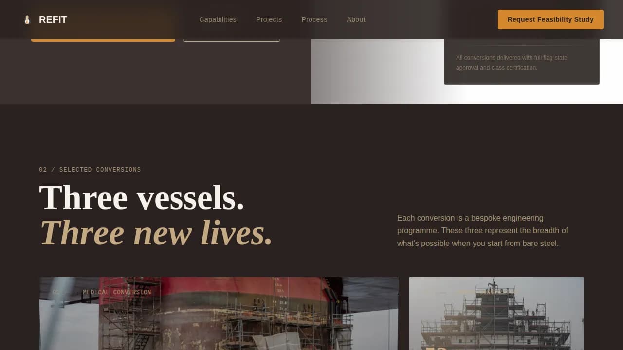 Refit is a high converting landing page template engineered for maritime industrial businesses operating in ship conversion and retrofit. The page opens with an aerial dry dock photograph, holds back its headline for two full seconds, then drops hard numbers in weld-spark amber across a 50/50 split-screen layout. Every scroll section leads with a dominant statistic before explanation follows, turning a single landing into a stacked, arithmetic case for conversion.