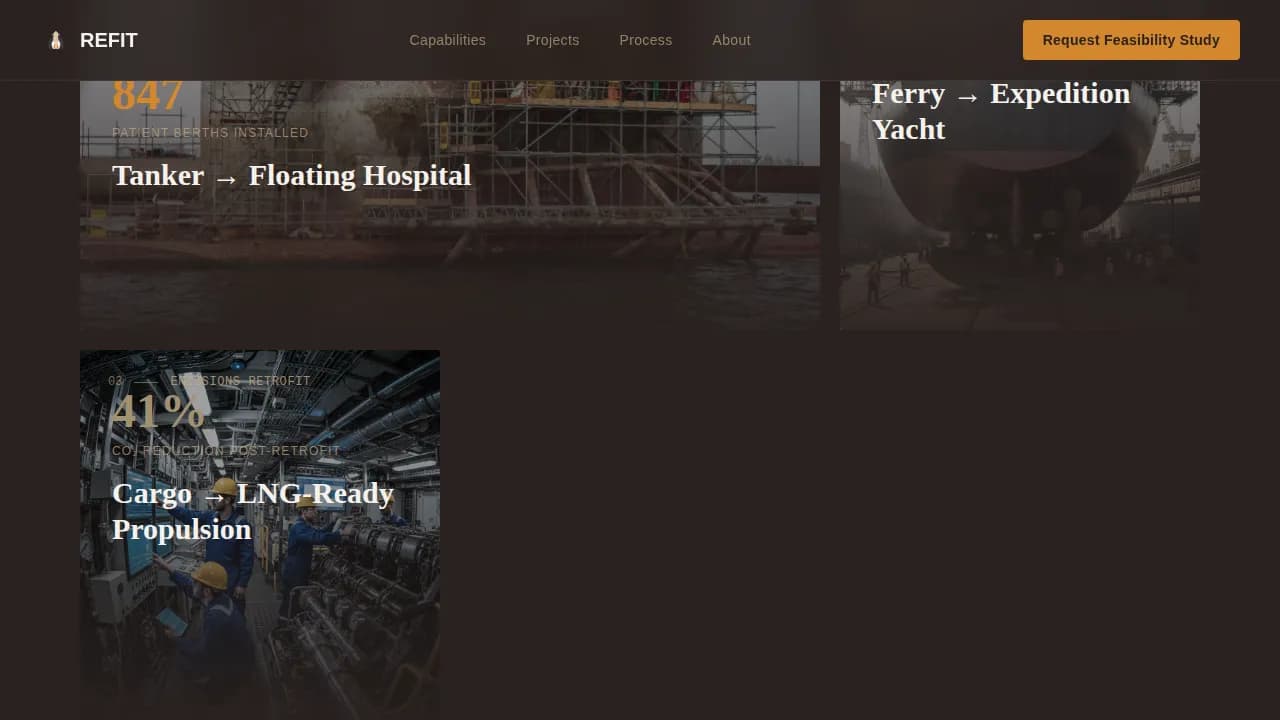 The Refit landing page template is built for ship conversion and retrofit yards targeting fleet decision-makers. A full-bleed aerial dry dock hero opens with delayed stat overlays, then a stats-first split-screen layout stacks hard proof, 127 conversions, 4.2M GT retrofitted, 98.7% on-schedule delivery, across every scroll section, driving qualified visitors toward a feasibility consultation request.