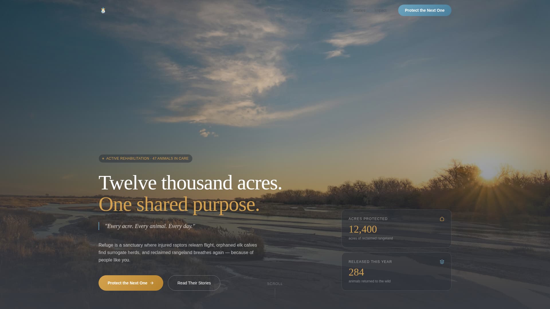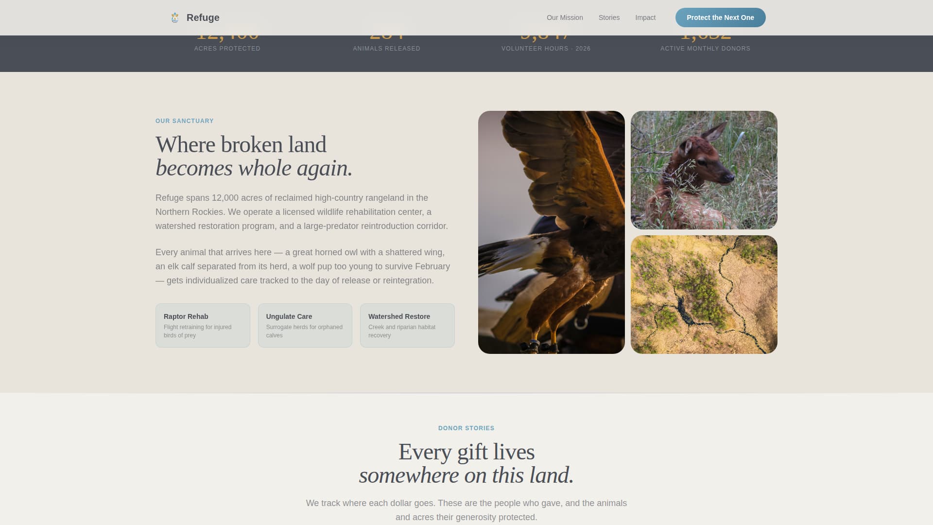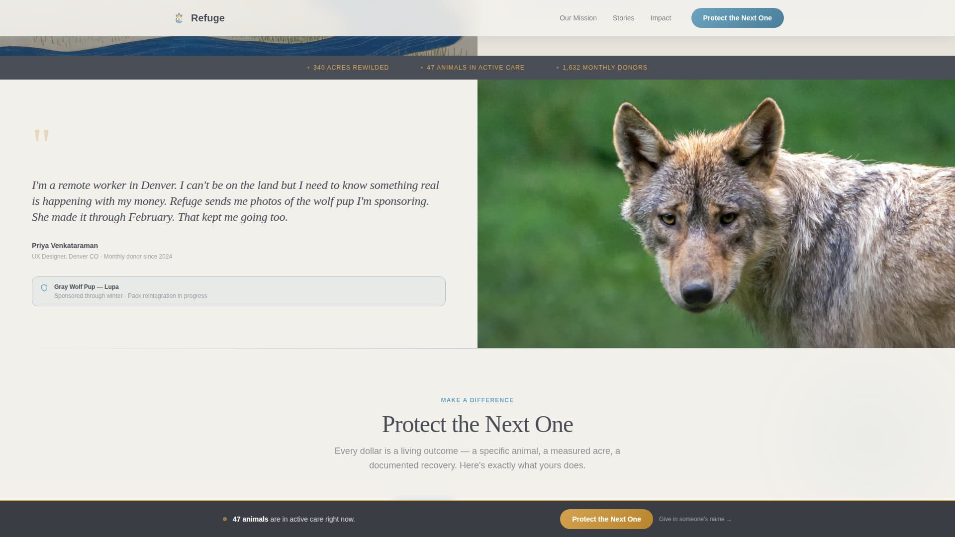 Most nonprofit donation pages treat dollars as line items. Donors read a number, feel nothing specific, and leave. Refuge solves the proof-of-impact gap by translating every donation amount into a visible, living outcome tied to a named animal or a measured acre of land.