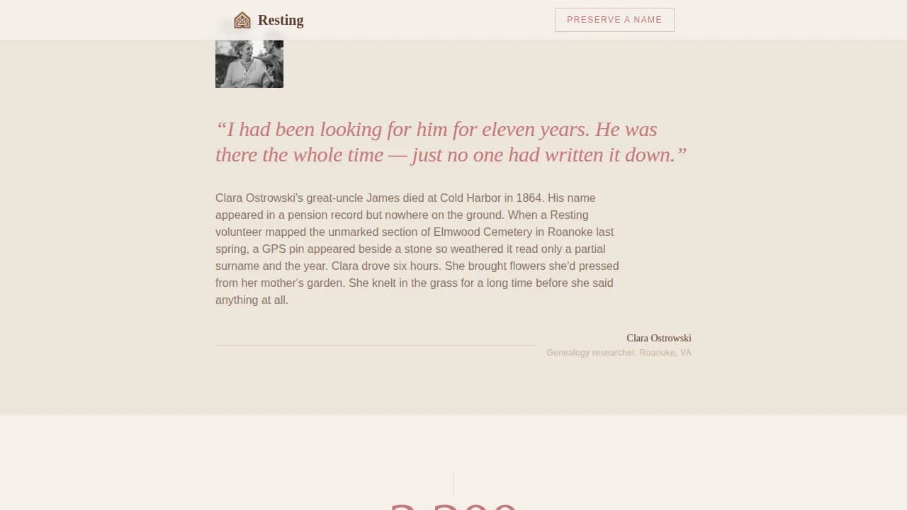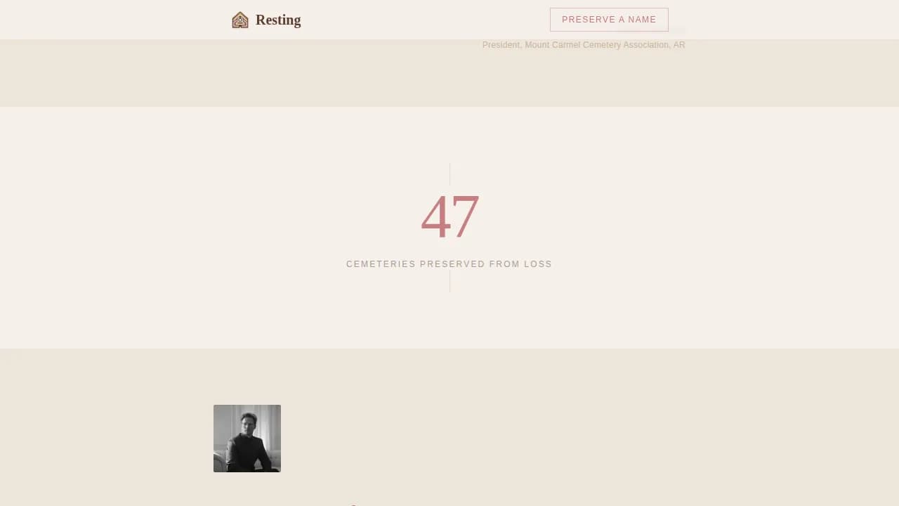 Resting is a cemetery mapping and records preservation landing page built to convert visitors into donors and volunteers. The page uses a Testimonial Mosaic flow, weaving human stories with quiet data points, so every scroll feels purposeful. A Desert Rose color system and portrait-centered hero set a tone of stillness and warmth from the first moment.