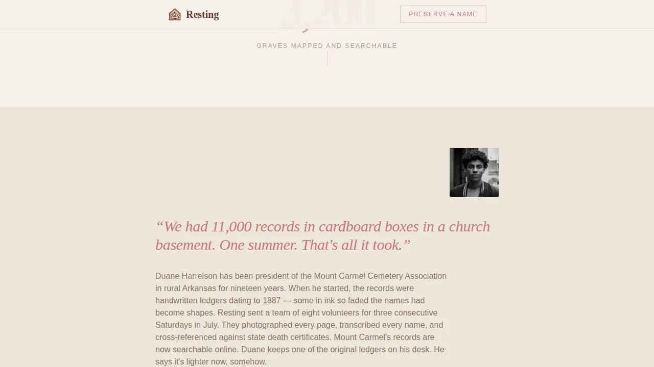 Resting is a single-column donation landing page designed for cemetery mapping and records preservation services. It guides genealogy researchers, cemetery board volunteers, and grieving families through a warm, testimony-driven scroll that builds trust and earns the gift. Three donation tiers and a volunteer sign-up form make every action feel specific and meaningful.