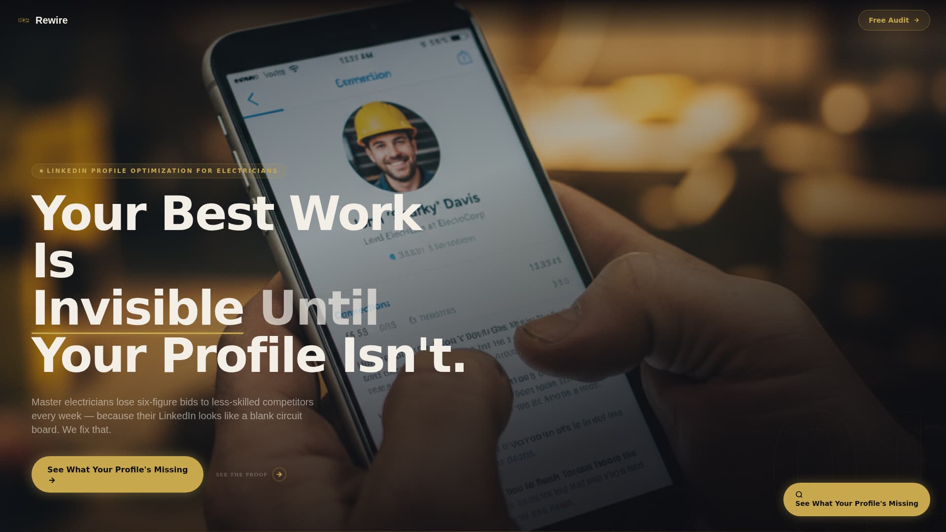 Rewire is a horizontal-scroll landing page template built for electrician LinkedIn optimization services. It guides visitors through a gallery-style before-and-after experience, showcasing real profile transformations. With a bold Obsidian and Gold visual identity, a floating call-to-action, and a single conversion goal, it turns skeptical tradespeople into booked audit leads.