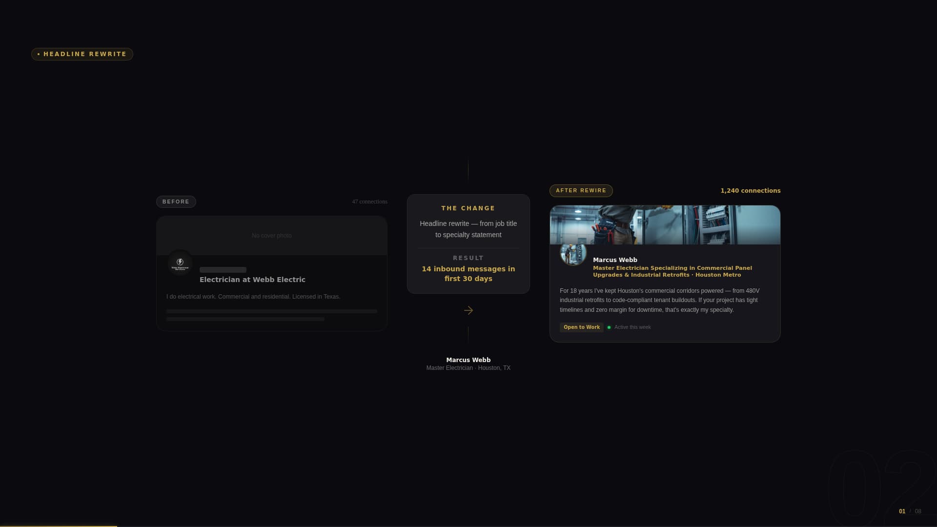 This template is built for a very specific kind of service provider: one who helps skilled tradespeople build a credible online presence. If you run a LinkedIn profile coaching or rewriting service aimed at the electrical trade, this template speaks directly to your audience.