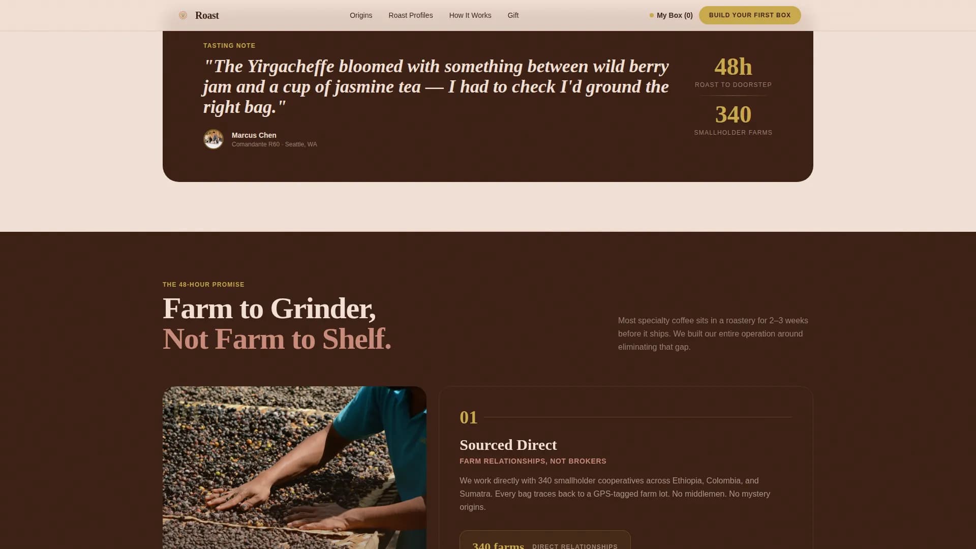 | Origin Card Grid | Proves provenance with farm-to-cup slider cards |