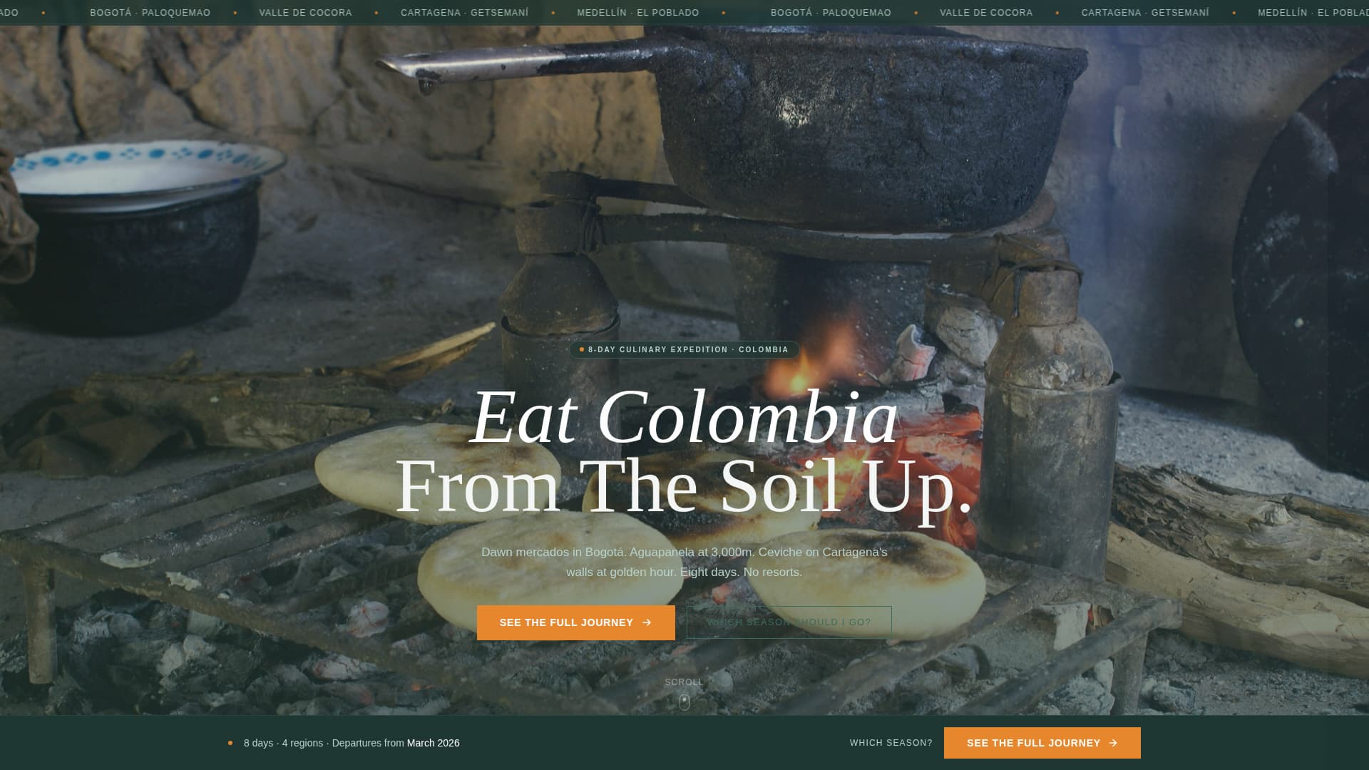The hero opens on a slow, handheld 16mm-textured video sequence moving from hands patting arepas, to aerial coffee terraces, to aguapanela steam rising into mountain air. The headline "Eat Colombia From The Soil Up" fades in over the final frame. Navigation stays hidden until the visitor begins scrolling.