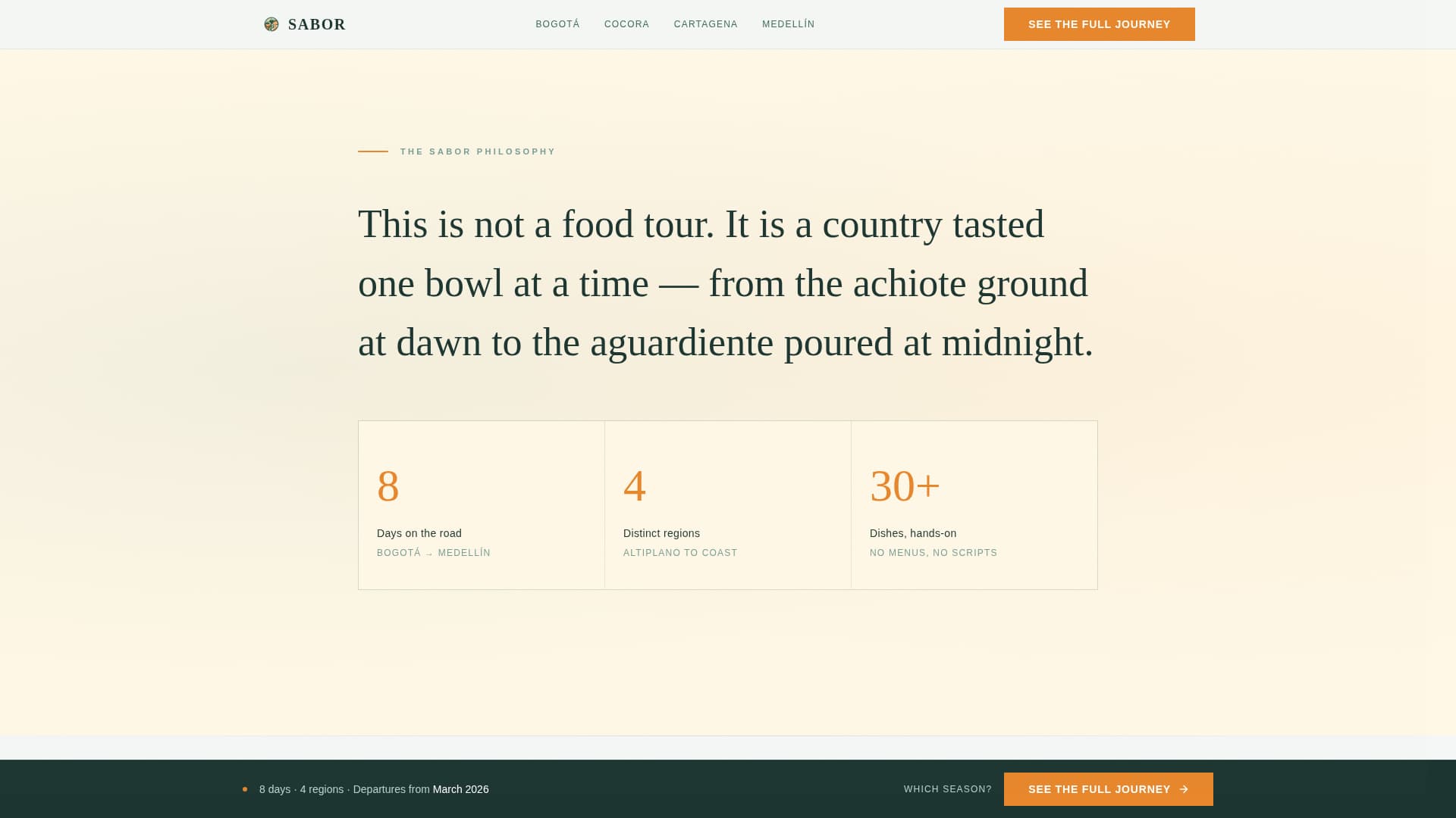 Sabor is built for a single conversion goal: the click to the full itinerary and booking page. Every structural decision serves that goal without using a form or showing a price early.