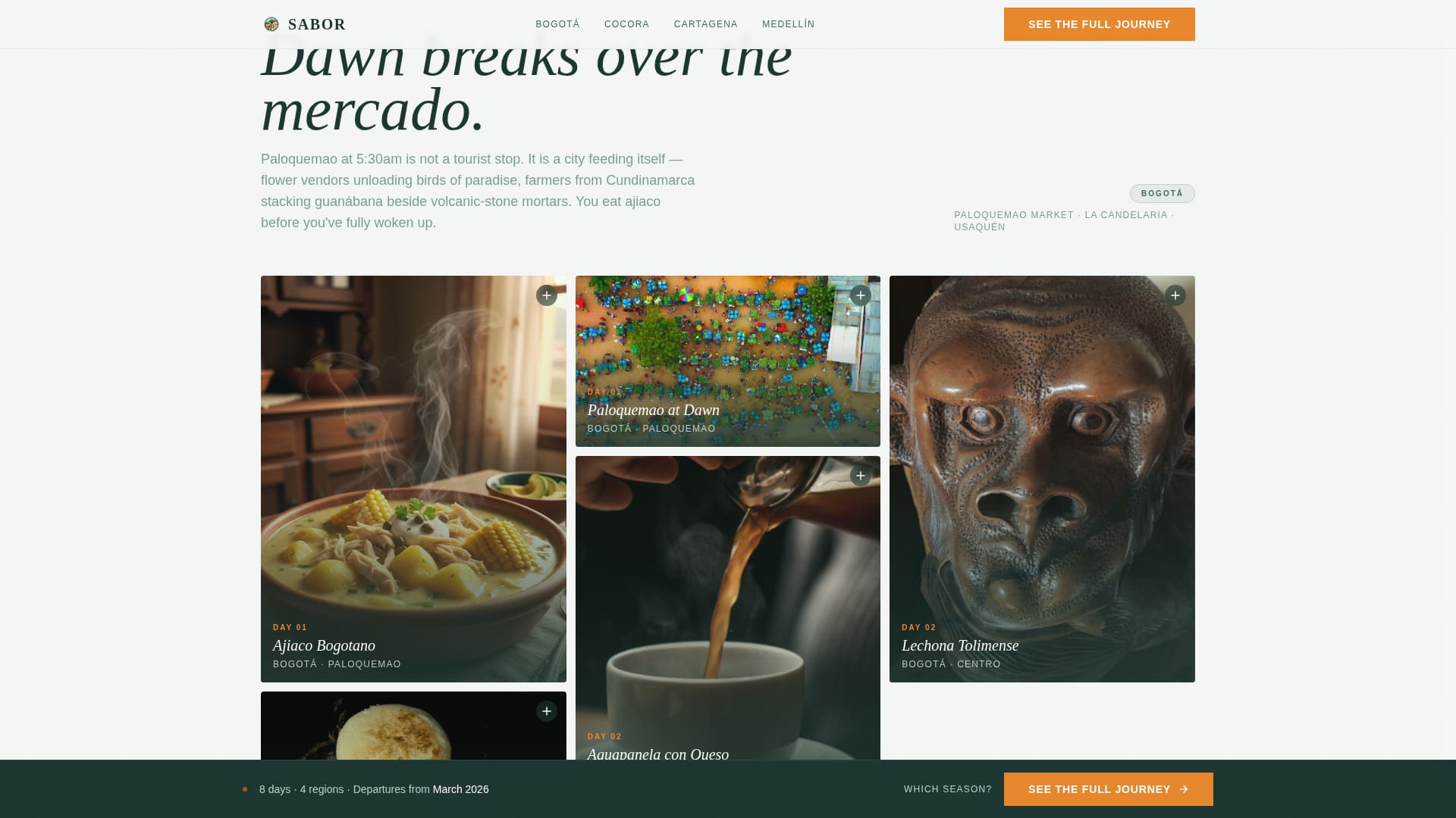 Sabor is a masonry-style culinary landing page built for Colombia food tour operators. It uses a full-screen video header, cinematic scroll sequences, and expandable dish cards to guide food-obsessive travelers from curiosity to the booking page. The Neo-Retro visual identity, region-by-region grid layout, and strategic call-to-action placement make the sensory case before a price is ever shown.