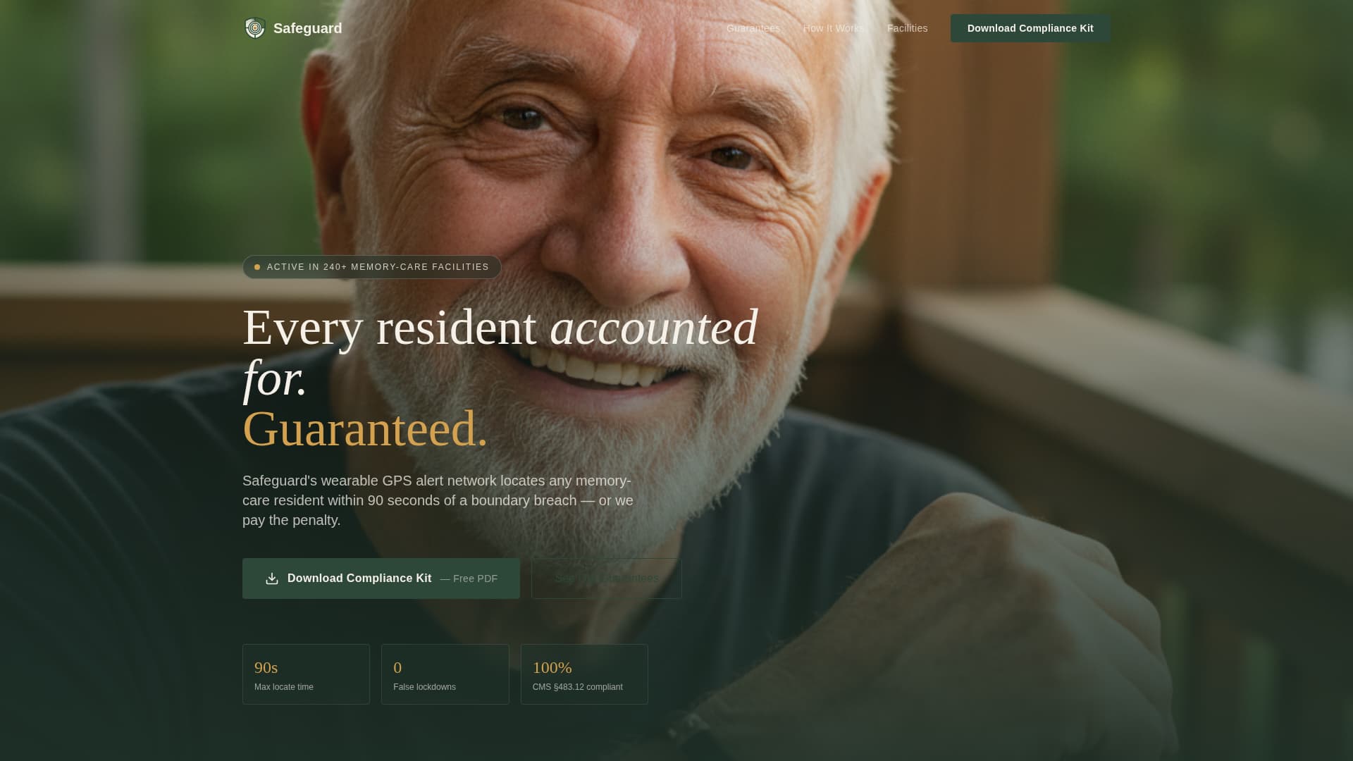 Safeguard is a single-column landing page template built for memory care wandering prevention services. It leads with three ironclad guarantees, walks visitors through a second-by-second breach timeline, and earns trust before asking for anything. The primary call to action is a free Compliance Kit download, designed to convert facility directors, family members, and municipal coordinators alike.