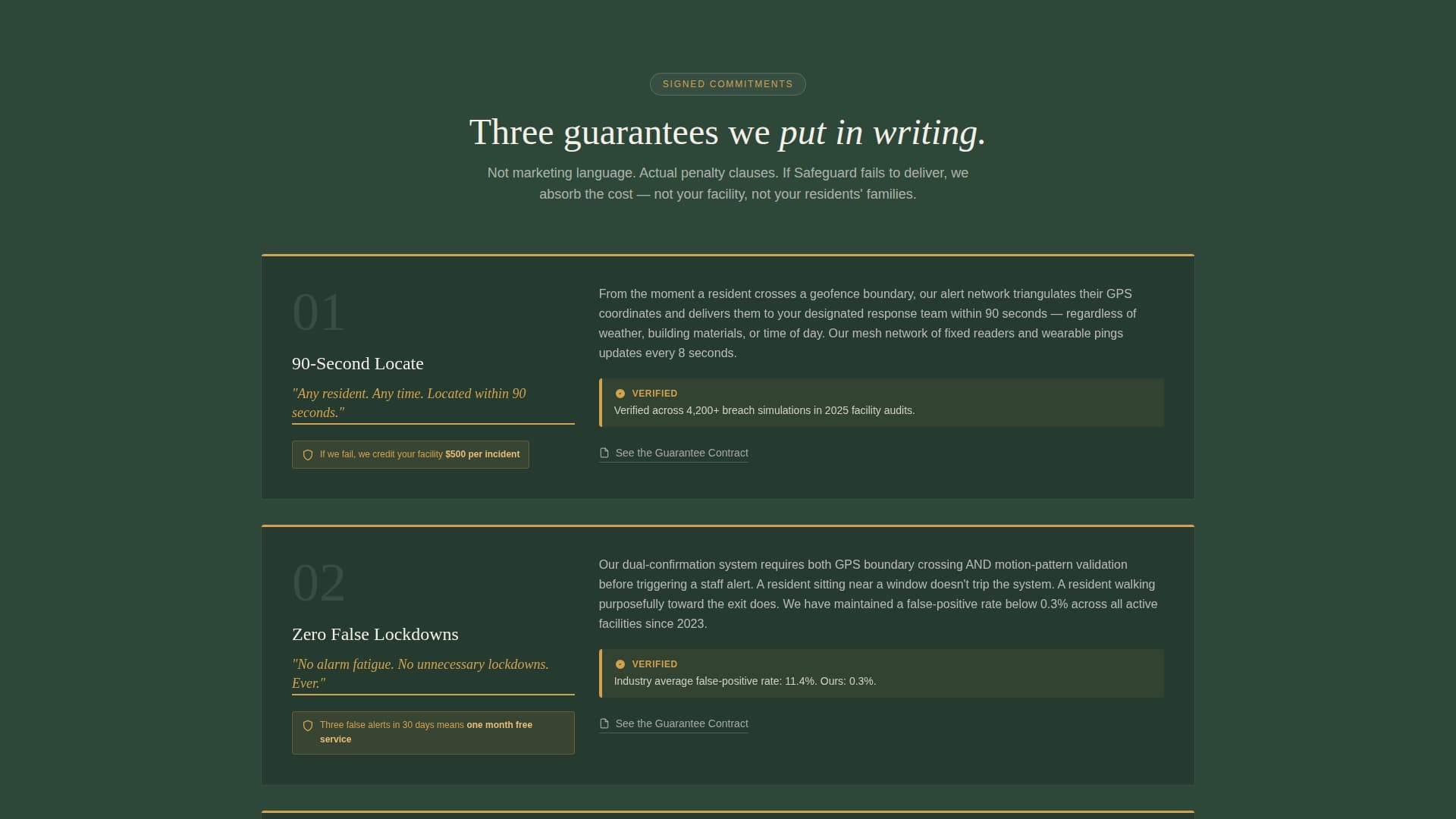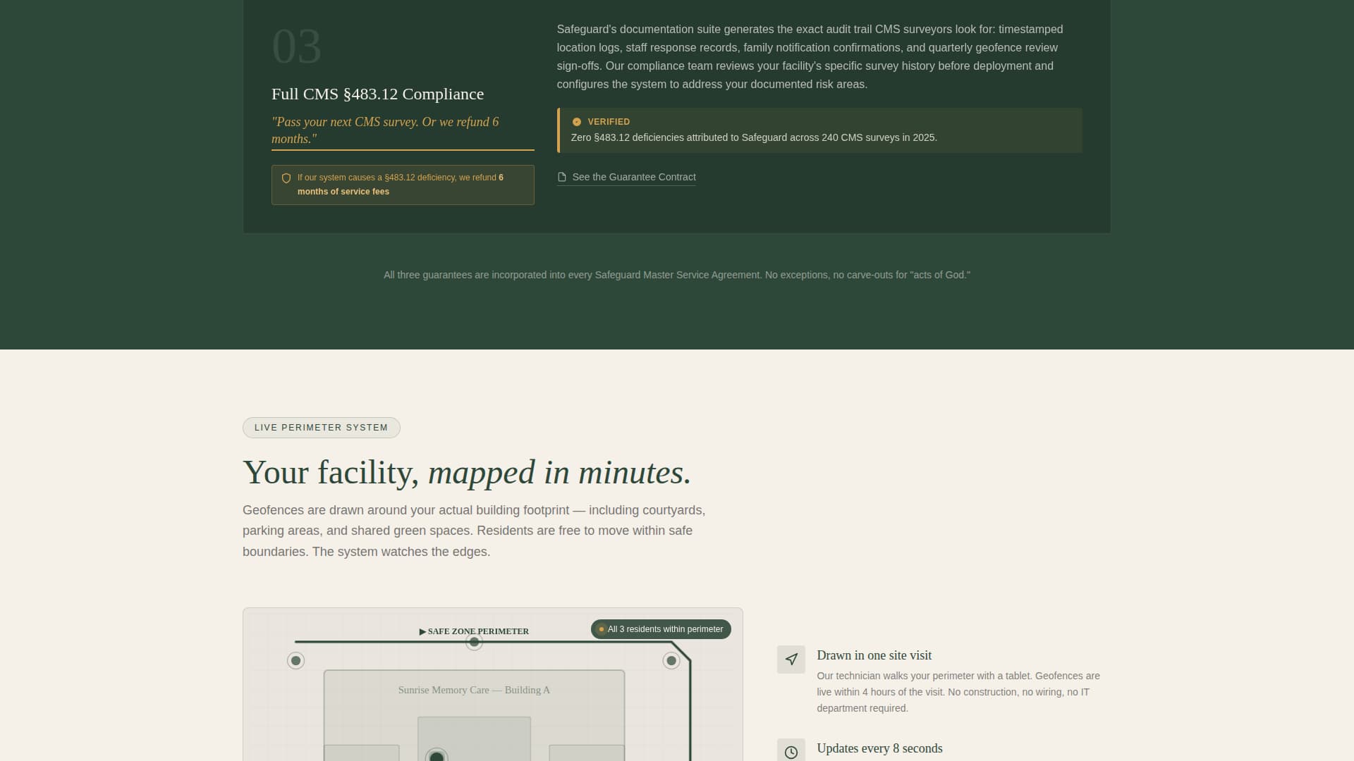 | Three Guarantees Block | Presents the 90-second locate, zero false lockdowns, and CMS §483.12 compliance as signed commitments |