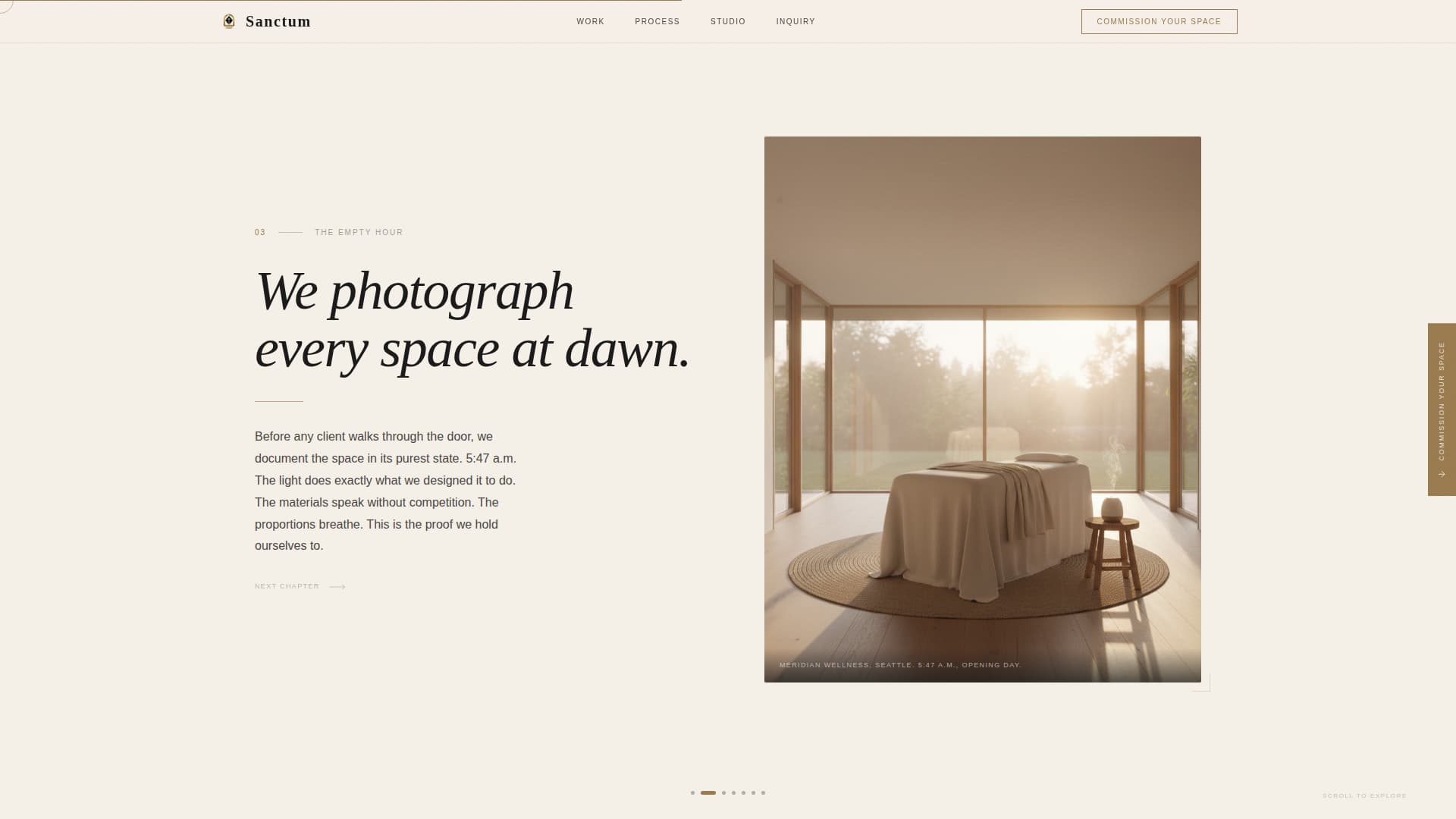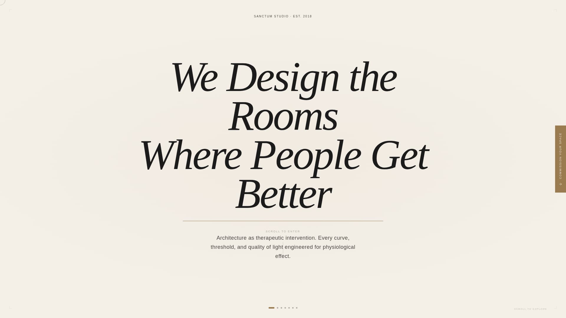 Sanctum is a single-page horizontal scroll template designed for luxury wellness architecture practices. It opens with a giant centered headline, unfolds an origin story across four lateral chapters, showcases selected works, and closes with a fixed brass-colored tab that expands into a paid consultation intake. The entire experience reads like a spatial monograph.