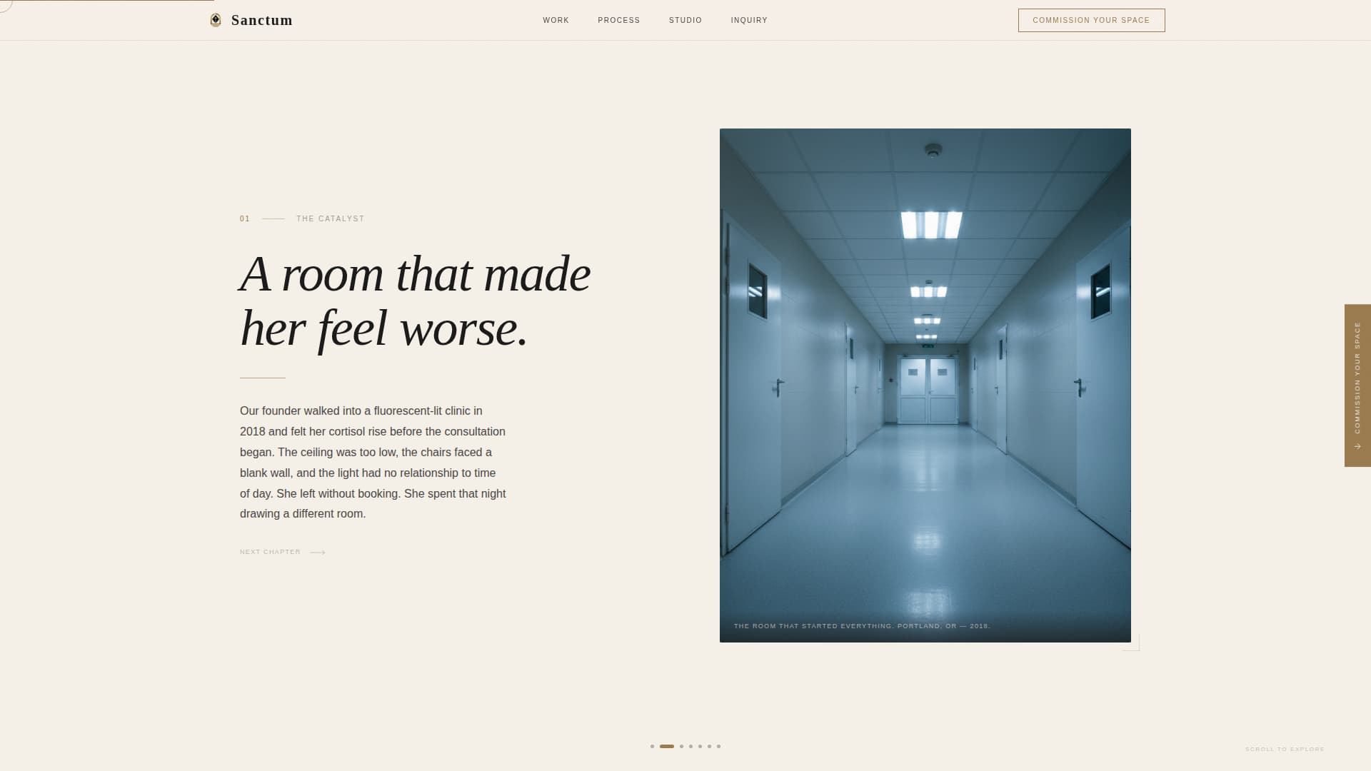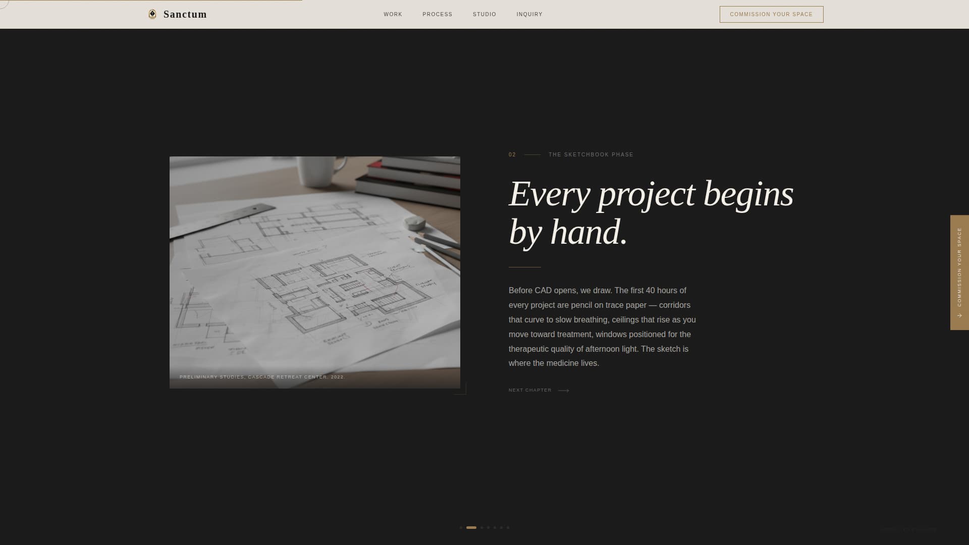 The origin story unfolds across four lateral panels using a GSAP-powered horizontal scroll. Each chapter represents a stage: a fluorescent-lit clinic that sparked the practice, hand-drawn sketchbook plans animated in real time, the first completed project photographed empty at dawn, and the same space alive with people mid-session.