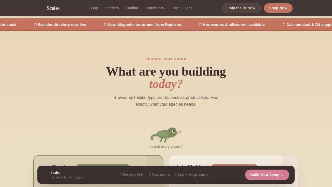The Scales warm community reptile supply landing page template is a single-column, delight-first marketplace landing page built for reptile shops and keepers. It pairs a living animated terrarium hero with biome-based category navigation, polaroid social proof, flip-card care tips, and a sticky "Build Your Setup" call to action, all wrapped in a warm desert earthy aesthetic.