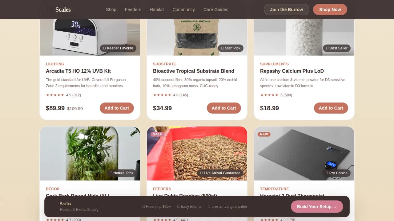 Generic pet store templates feel cold and catalog-like. Reptile enthusiasts need a website that earns trust through education and personality, not just product grids.