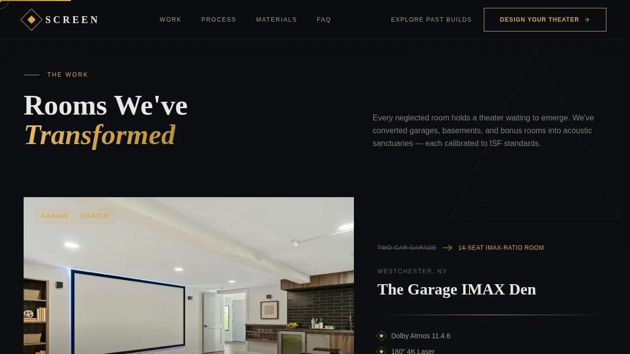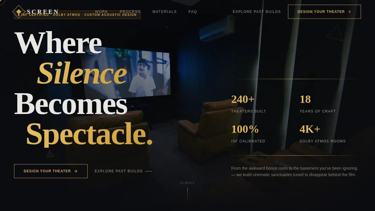 Screen is a cinematic dark luxury landing page template built for home theater design studios. It uses an asymmetric 60/40 grid, a scroll-linked atmosphere that deepens with every section, and a dual call-to-action flow to guide visitors toward a project gallery and consultation booking. The design feels like the moment the house lights go down.