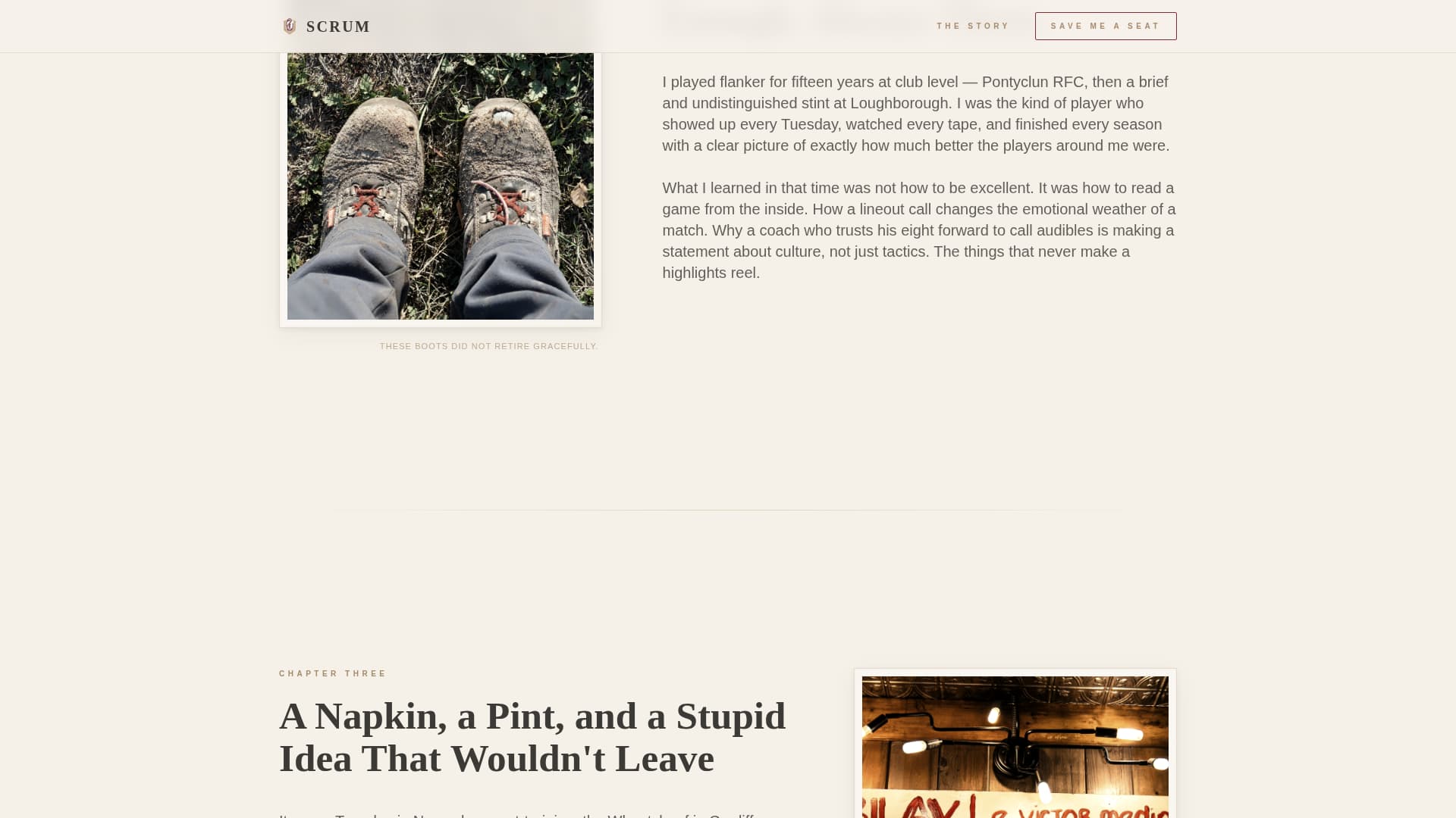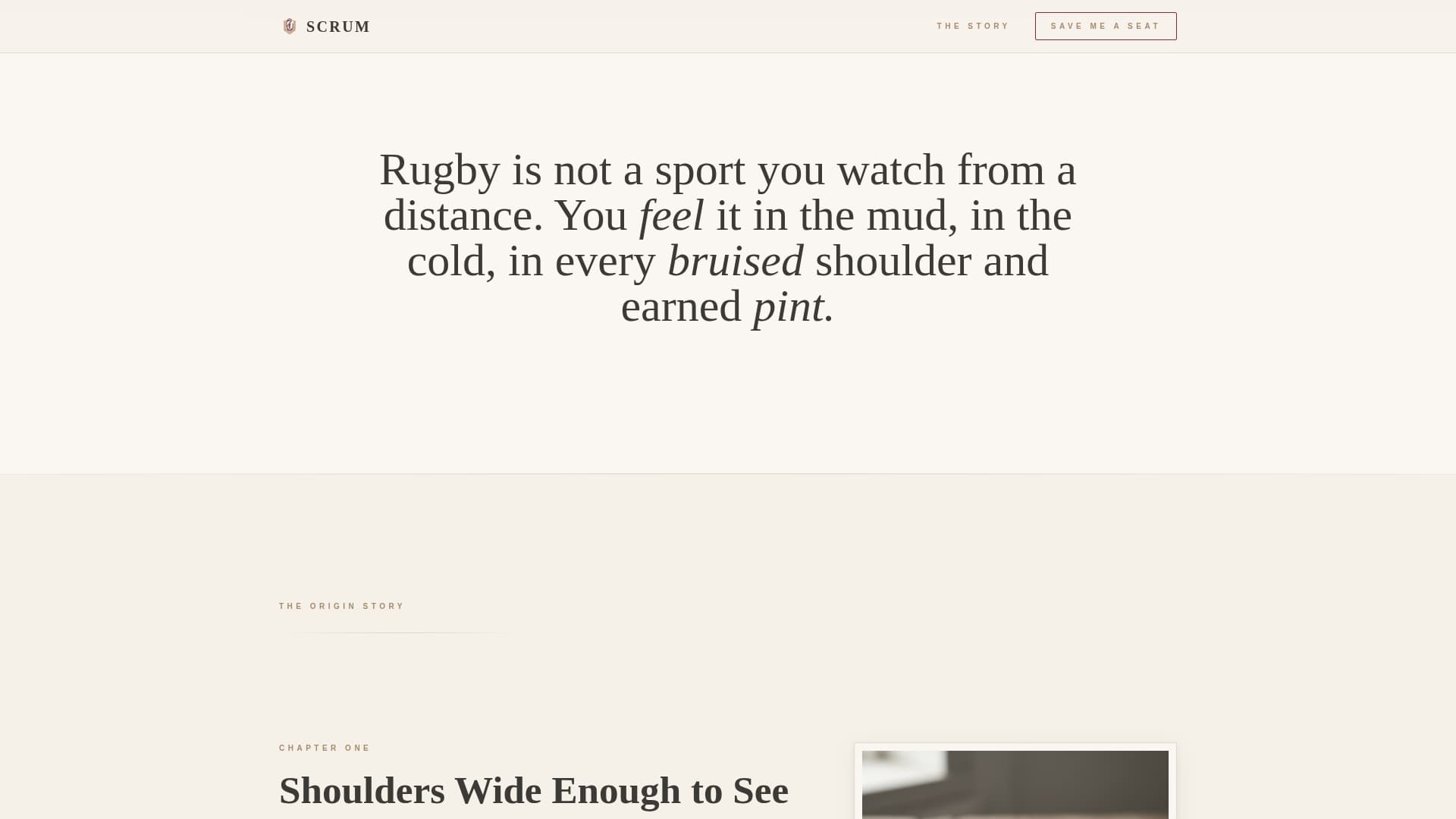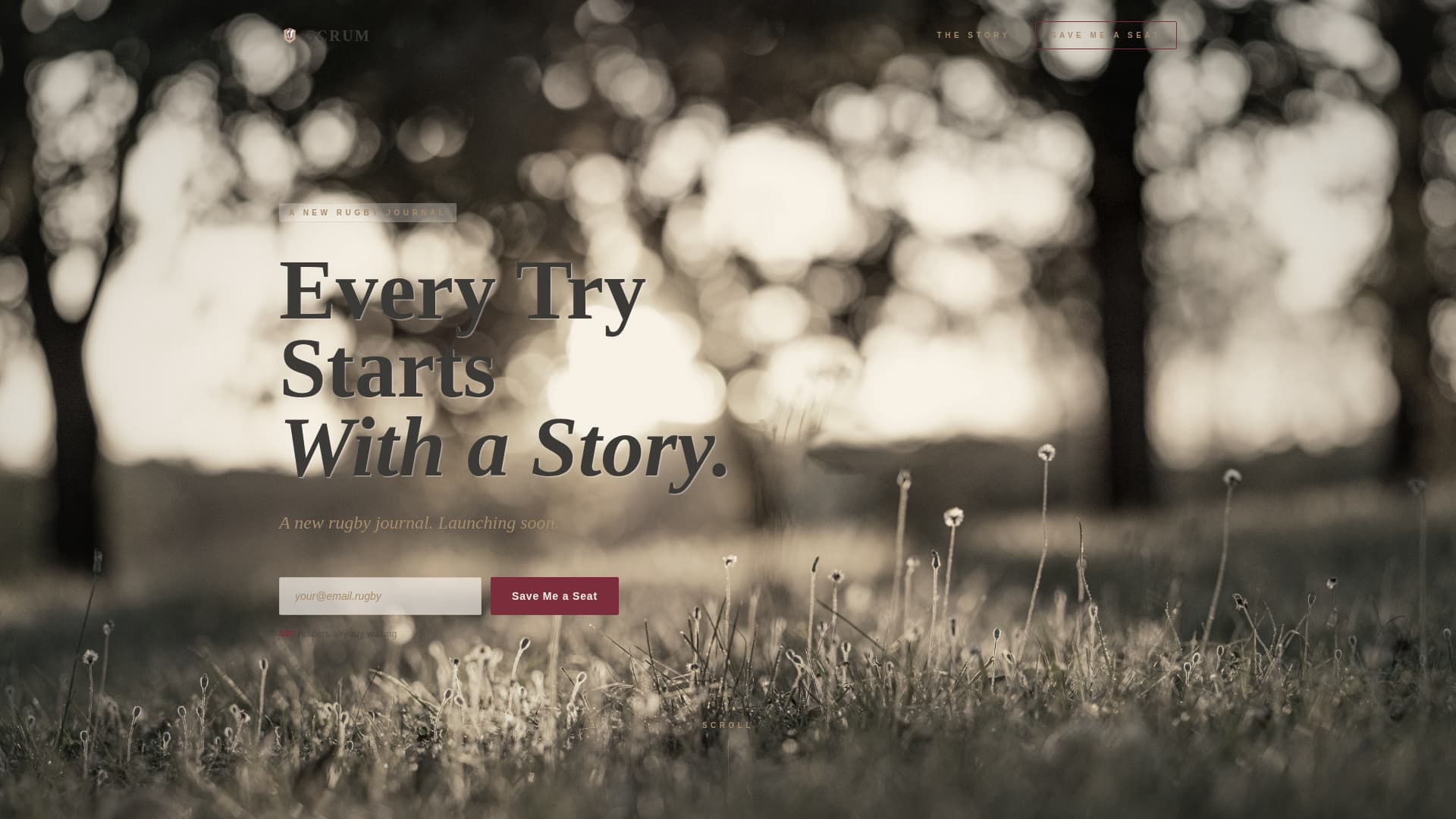 Scrum is a single-page waitlist landing page for a passion-led rugby blog. It uses an asymmetric 60/40 grid to guide visitors through a personal origin story, building emotional investment before the final signup call to action. The warm artisan design feels editorial and handcrafted, like a well-thumbed match programme rather than a generic web page.