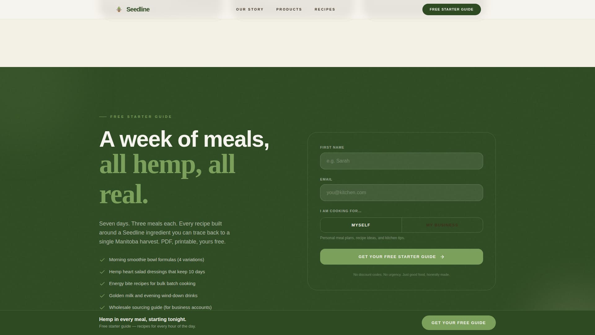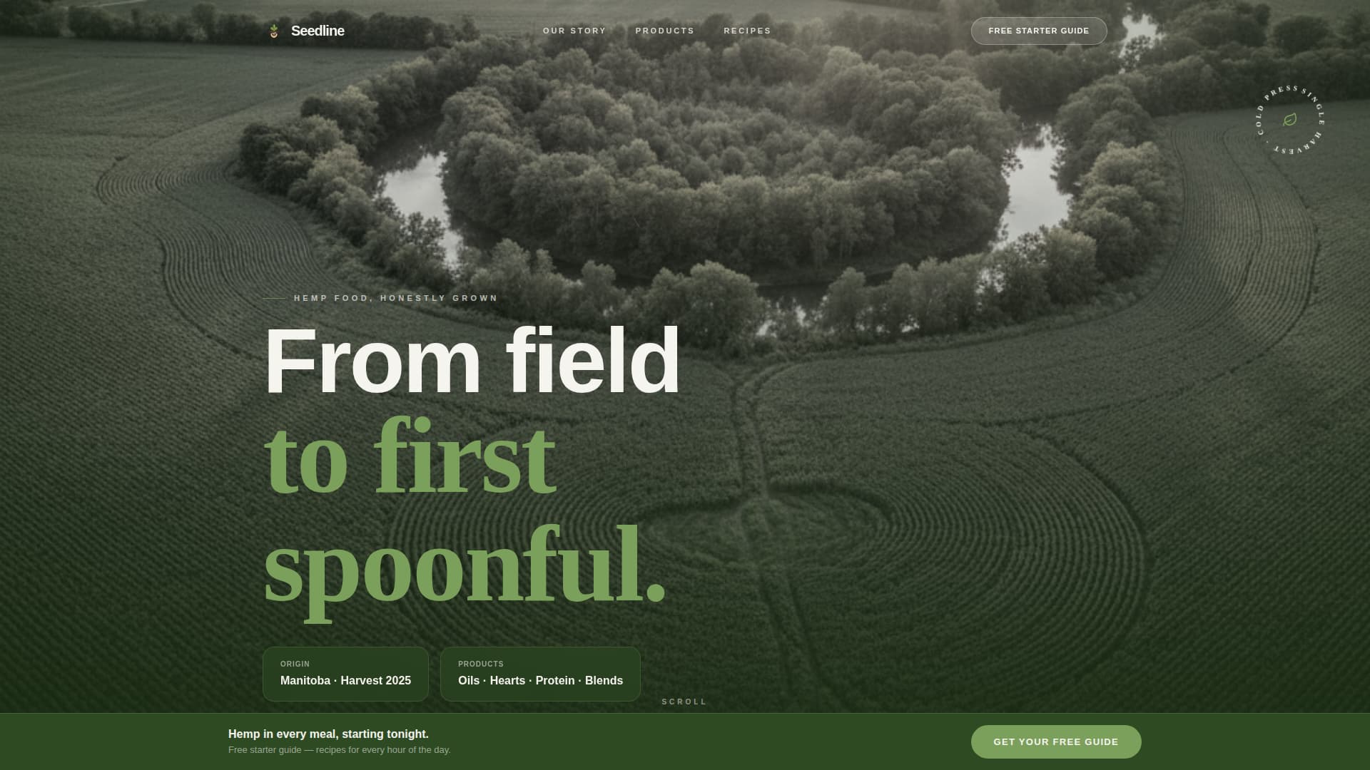 Seedline is a hero-dominant landing page template built for hemp food and nutrition brands. It guides visitors through a dawn-to-dusk meal narrative, pairing each eating moment with a hemp product. A lead generation form with a personalization toggle captures first-time cooks and business buyers alike, converting curiosity into qualified contacts with a free downloadable starter guide.