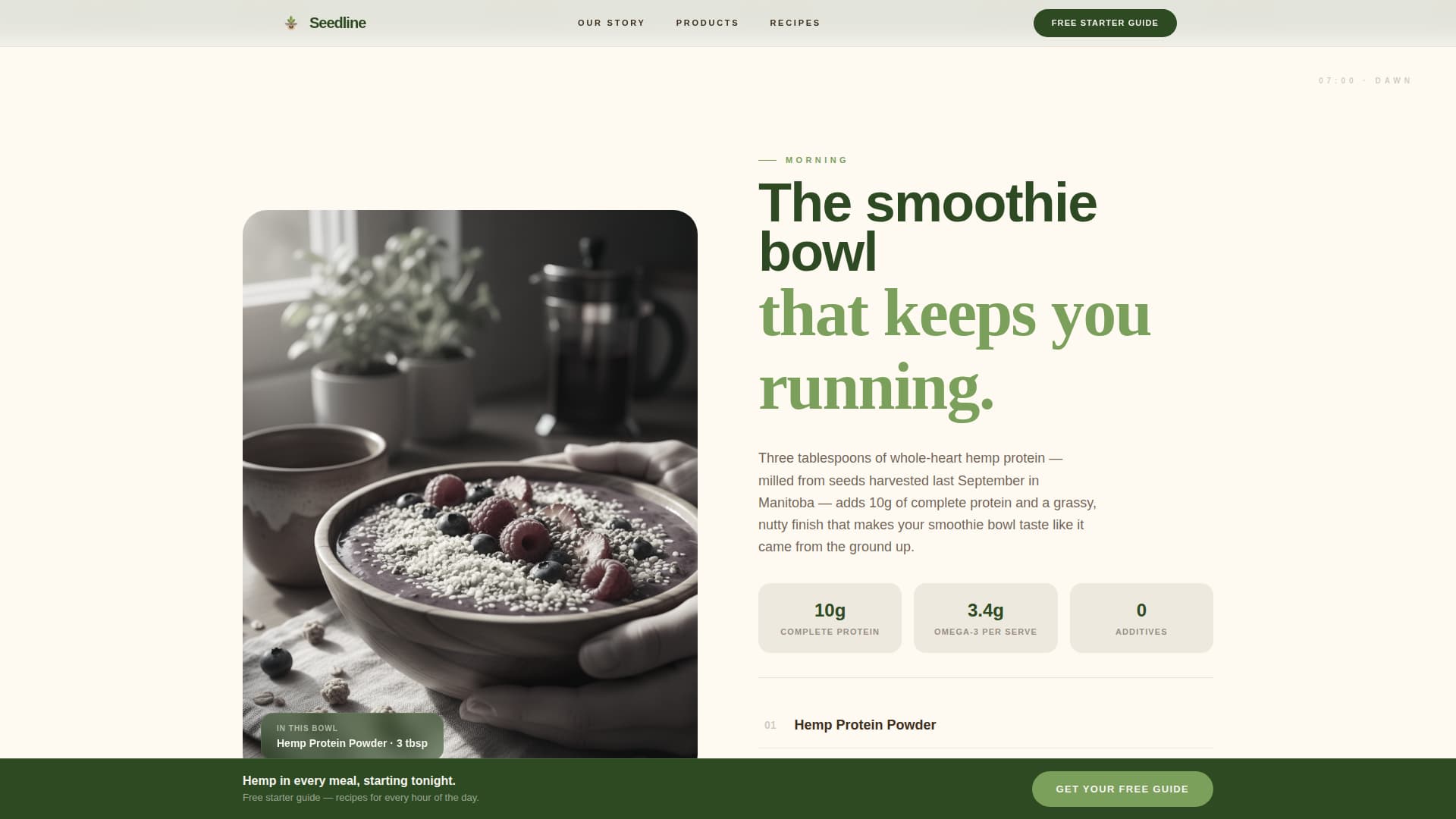 Seedline is a single-page hemp food and nutrition landing page template. It uses a cinematic dawn-to-dusk structure, moving visitors through real meal moments from morning smoothies to evening golden milk. The page builds trust through editorial photography and intimate copy, then earns a lead with one clear offer: a free downloadable hemp meal plan and recipe booklet.